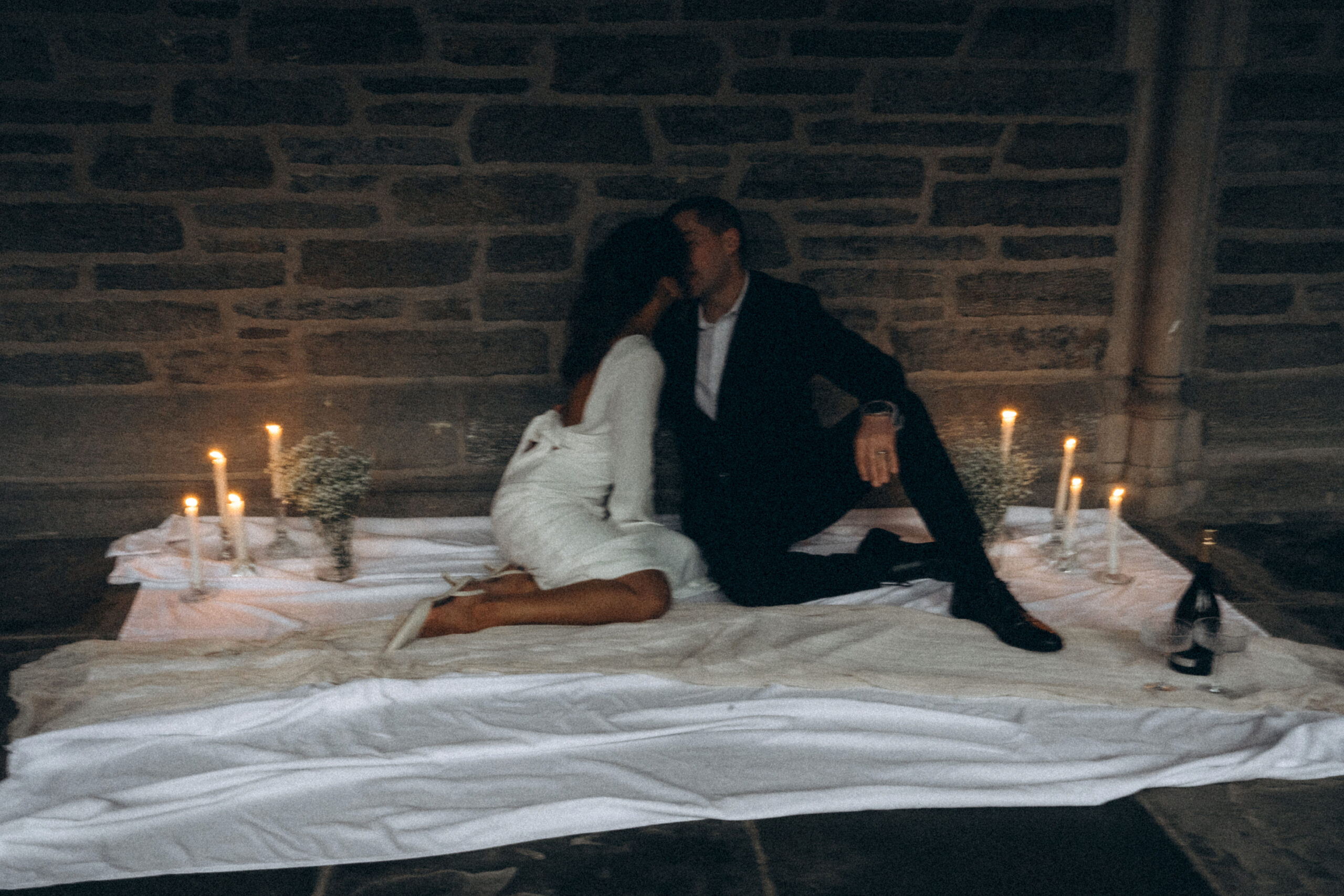 The day of the photoshoot was met with pouring rain, but that didn’t stop us from creating magic. We improvised and used the campus as our backdrop, taking advantage of the beautiful archways and architecture. The lovebirds brought along some special items to help recreate their wedding day, including a cake and champagne with glasses for a mini champagne tower. I surprised them with flowers and candles to add to the romantic atmosphere.
