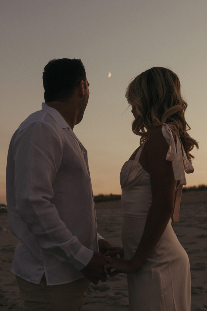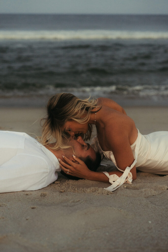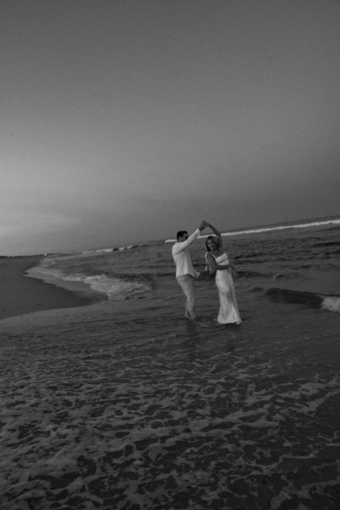 For the more relaxed part of the session, they both changed into outfits that were comfortable yet classy. They kicked off their shoes, with Joe switching dress pants for khakis and keeping his crisp white shirt, and Amy changing into a gorgeous silky dress with bows on the shoulders. Their outfit choices perfectly matched the vibe we were going for – allowing for lots of movement, fun, and getting those documentary shots in the ocean and sand.