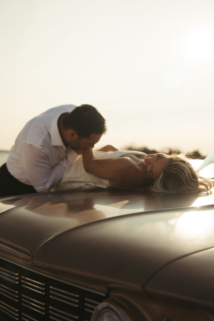 Amy and Joe’s engagement session was one for the books! From the vintage car photos to popping champagne on the boat, and ending with those dreamy beach shots under the moon – every moment was perfect. I love how we brought their vision board to life while incorporating so many meaningful elements at Joe’s family home.