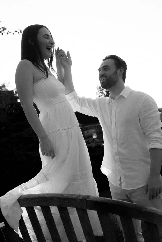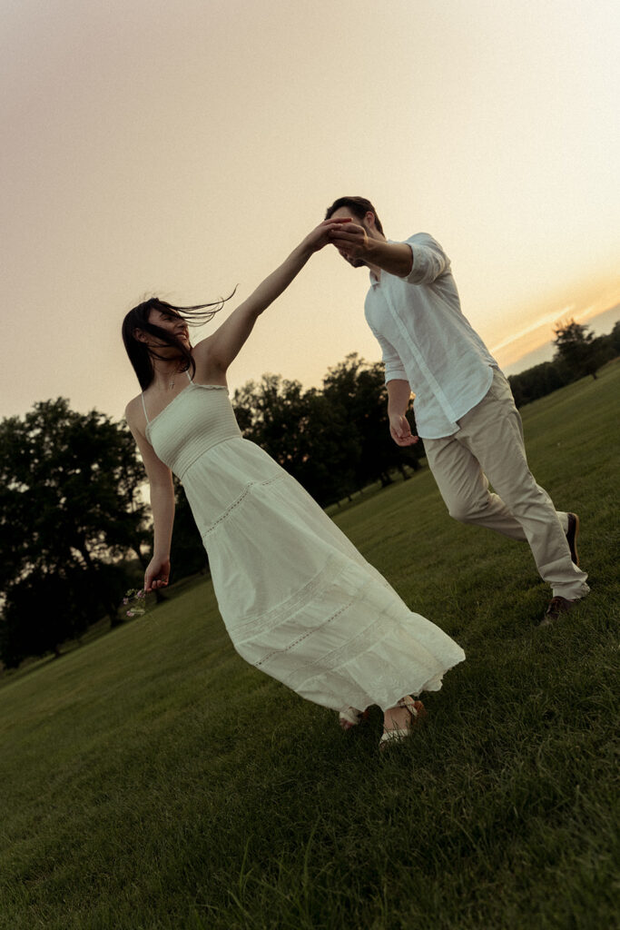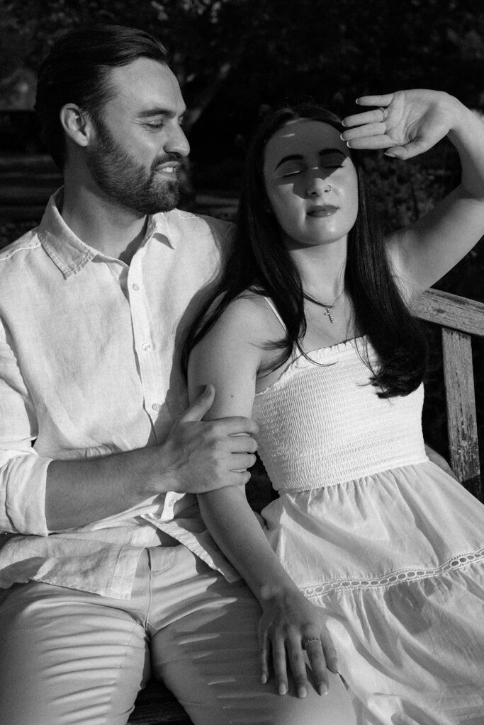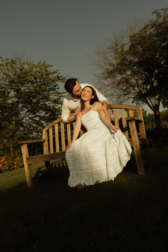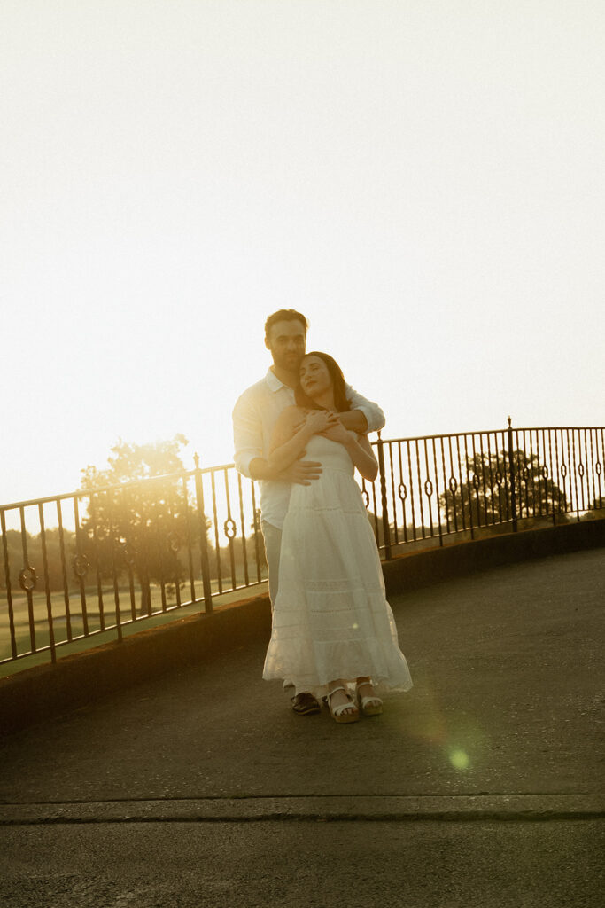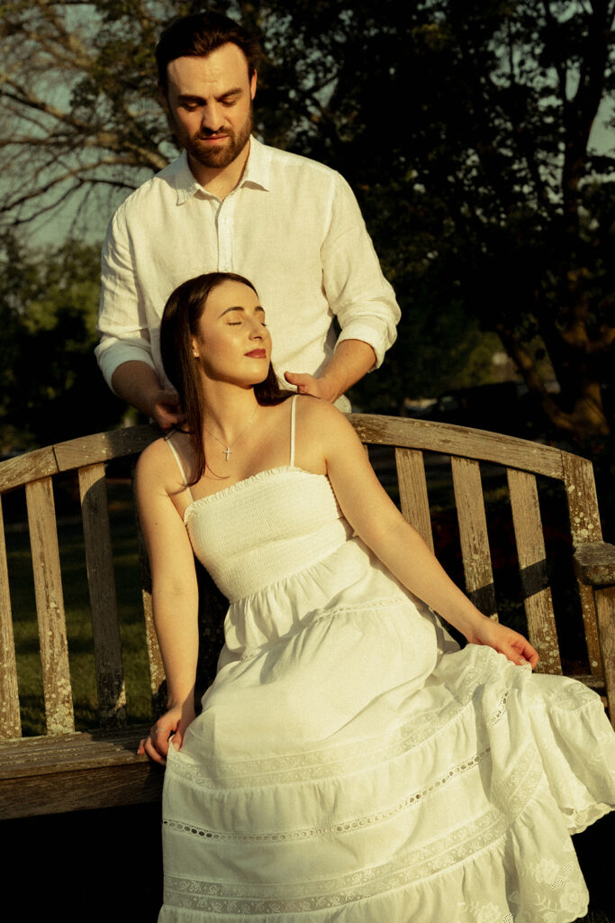 We began the shoot a little before sunset. The lighting greatly contributes to the overall feel of the session, and I wanted them to look golden. The sun is a great accent and so fun to play with when it comes to angles, but it’s also a huge help in highlighting them as subjects. We used it to our advantage in so many ways – literally for certain poses where she blocked the sun with her hands, to having beams of light peek through the trees. When it came to their inspiration, they actually sent me my own work! They loved many of my past sessions and wanted to incorporate certain aspects into their own shoot. There were so many cute places to visit – benches, bridges, and colorful flowers lining the property. I even had them lay in the grass together, which is an example of one of the poses they loved from previous shoots. They picked flowers and incorporated them in. It was so sweet!