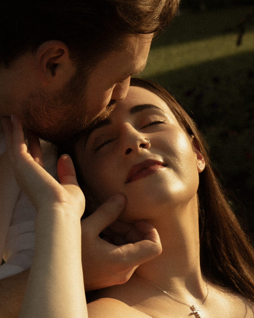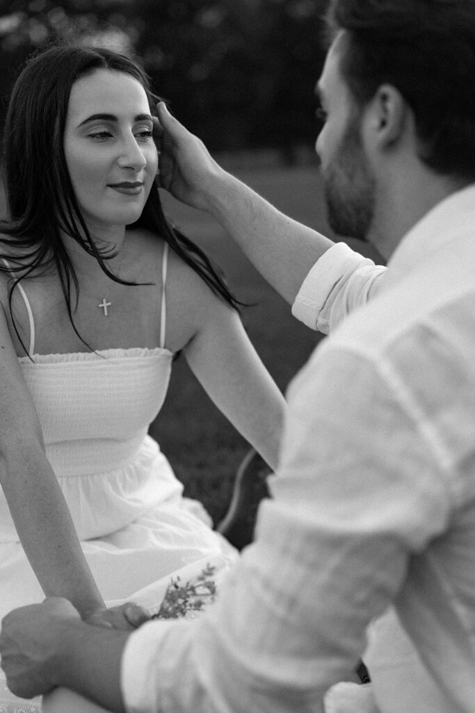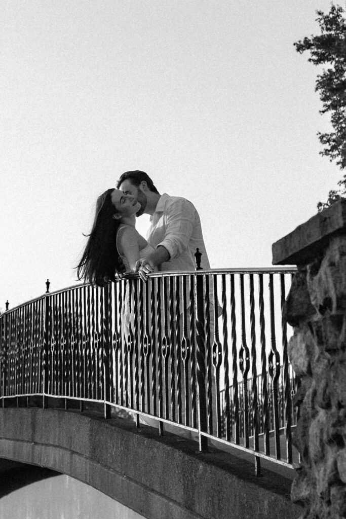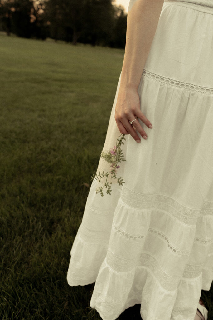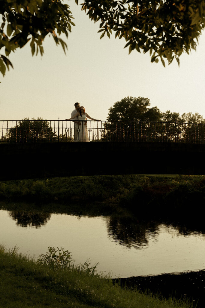 We began the shoot a little before sunset. The lighting greatly contributes to the overall feel of the session, and I wanted them to look golden. The sun is a great accent and so fun to play with when it comes to angles, but it’s also a huge help in highlighting them as subjects. We used it to our advantage in so many ways – literally for certain poses where she blocked the sun with her hands, to having beams of light peek through the trees. When it came to their inspiration, they actually sent me my own work! They loved many of my past sessions and wanted to incorporate certain aspects into their own shoot. There were so many cute places to visit – benches, bridges, and colorful flowers lining the property. I even had them lay in the grass together, which is an example of one of the poses they loved from previous shoots. They picked flowers and incorporated them in. It was so sweet!