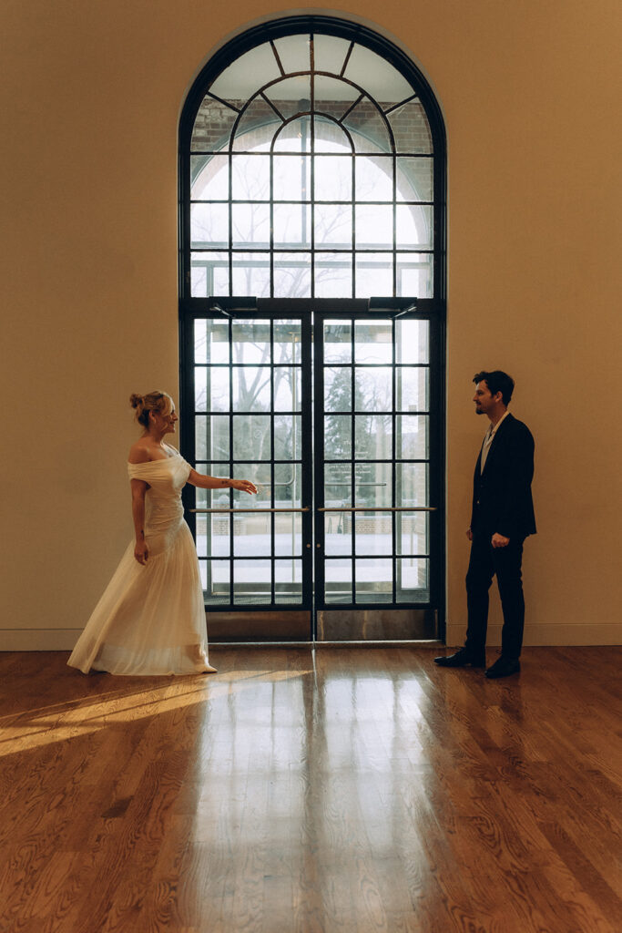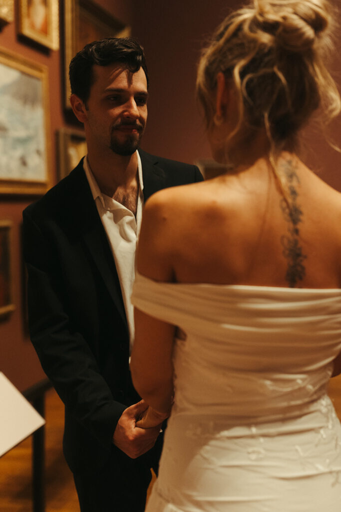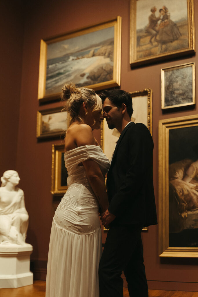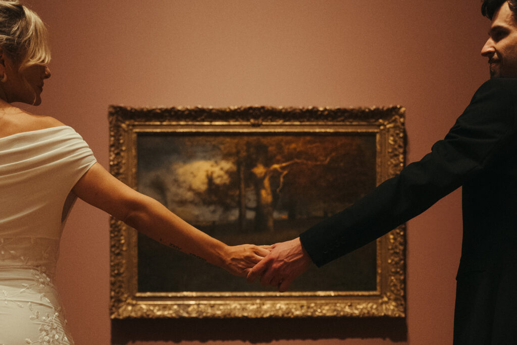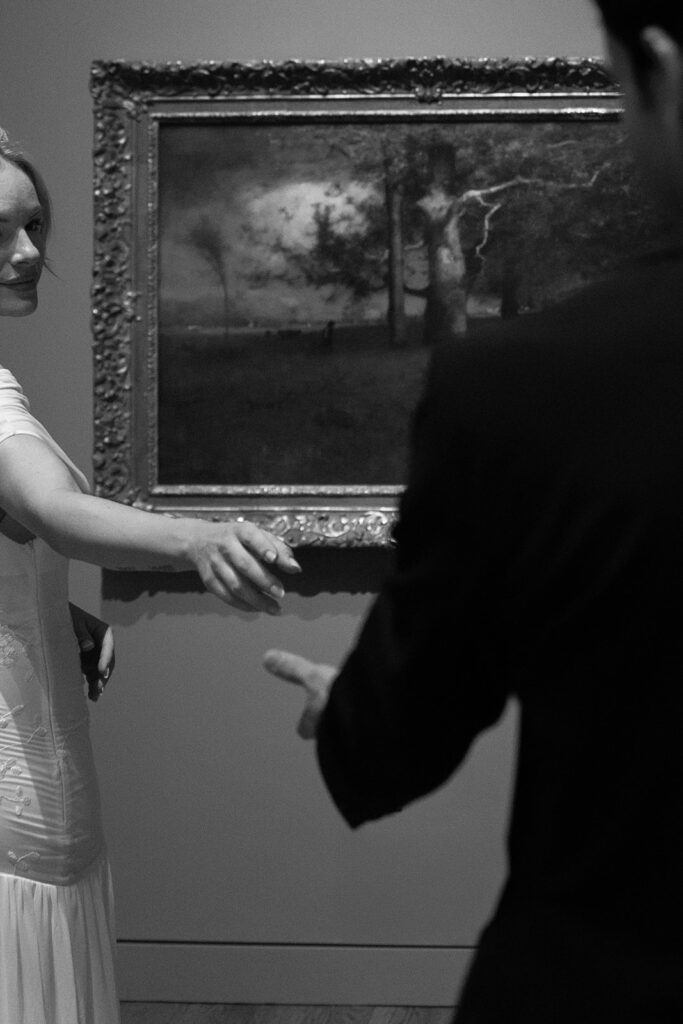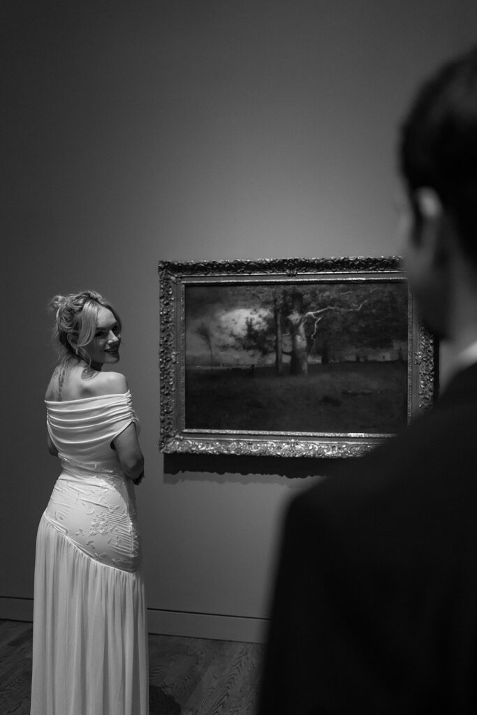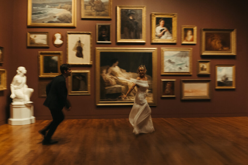 Genevieve and Will’s Delaware Art Museum session was an absolute dream! From those cinematic shots in the moody purple gallery to capturing them spinning under the gold-framed paintings – every moment was stunning. I loved how we brought their sophisticated vision to life in such an artistic space.