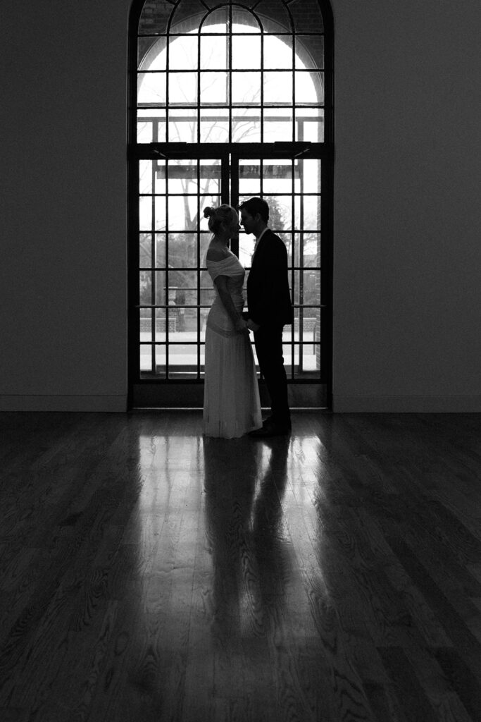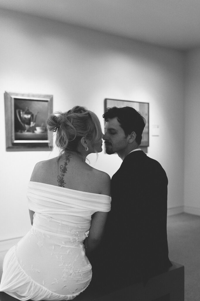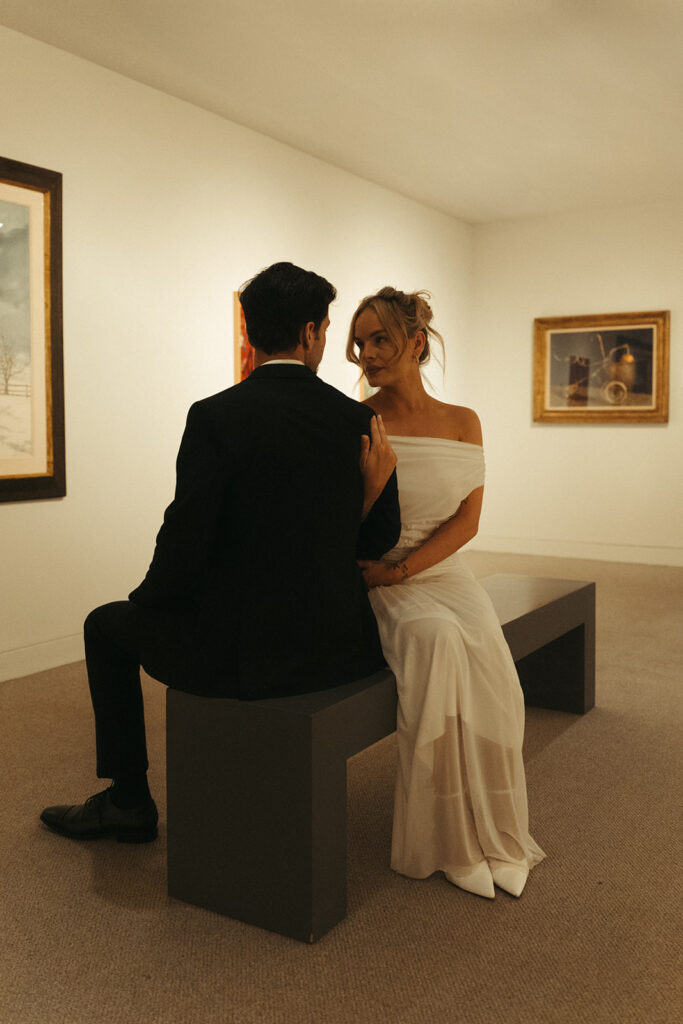 For this session, we wanted a sophisticated and moody vibe. The art museum was perfect – it tied in dark academia with modern elements. They wanted an upscale artistic look, which we absolutely nailed. Their outfits were perfect choices – Genevieve in a white off-shoulder dress and Will in a classic suit. For the outdoor portion, she added this stunning faux fur shawl.