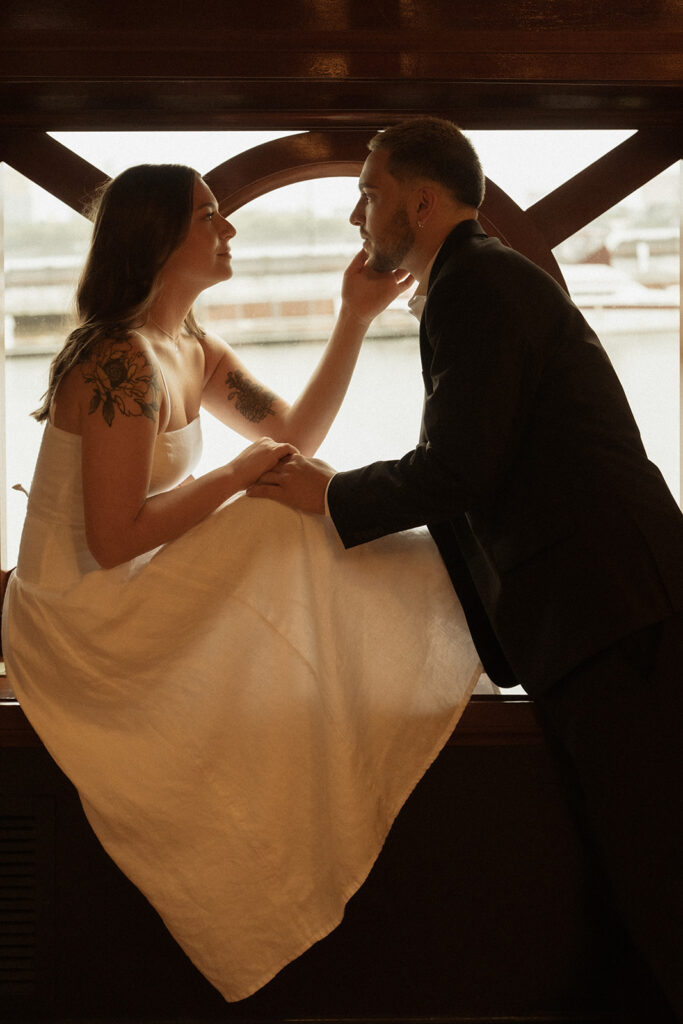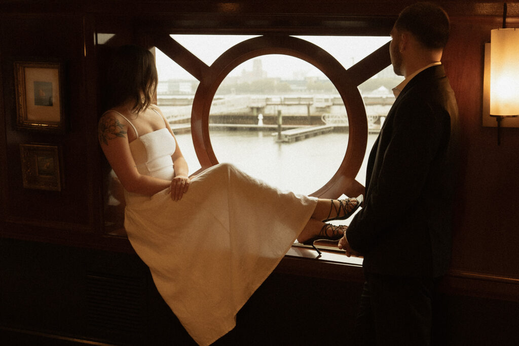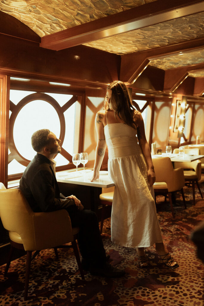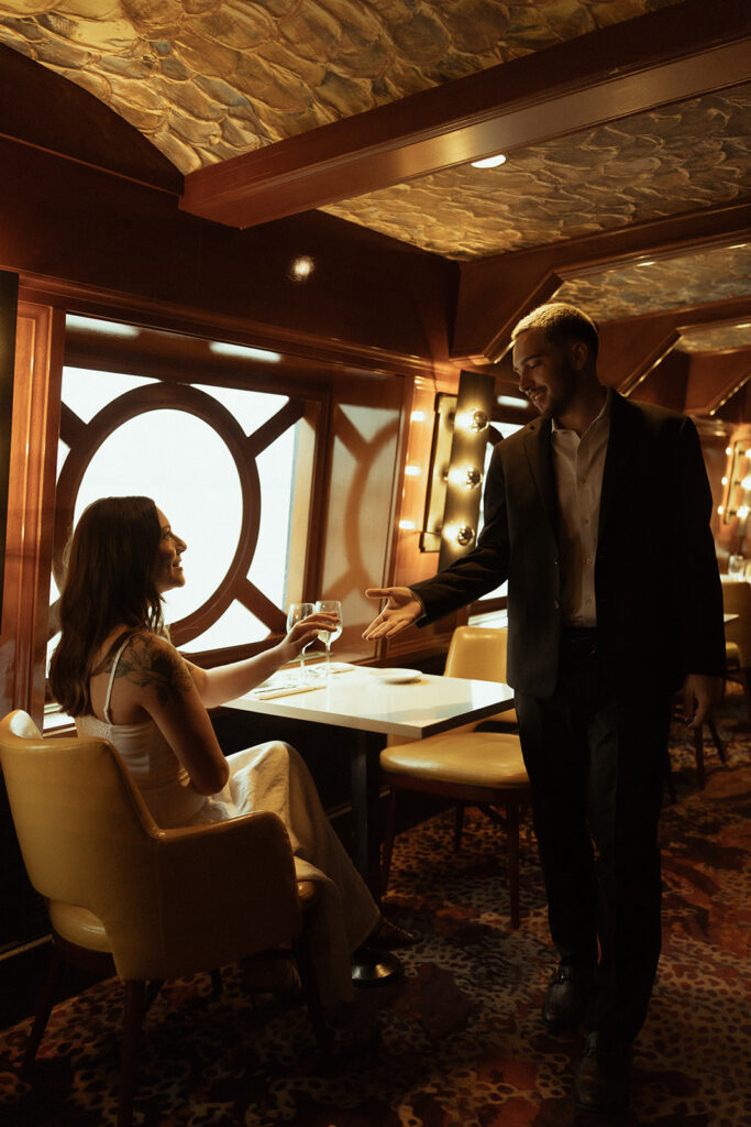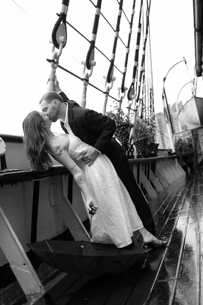 We had them get drinks at the bar and sit down at a table by one of the windows to enjoy each other’s company. I also had them dance a bit—him twirling her around. They both had so much fun during their session. They were very confident and happy to do anything the other person asked. They truly just wanted to make each other happy. We utilized almost every aspect of the ship. We found a cute nook where she could sit on the ledge and look out the window, and we did a few poses there that I loved. We also, of course, had to take photos on the staircase. This truly gave me all of the emotions and feels. They were so gentle and loving, and wanted their photos to reflect that! We eventually made our way outside, where it was gloomy and raining, but it was perfect for the mood we were going for! The couple brought an umbrella, and we incorporated that into the photos. This portion truly felt like you were taken back in time. It was perfect in every way.