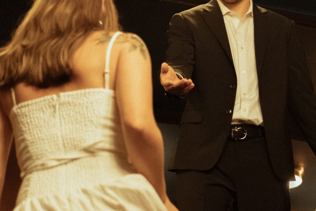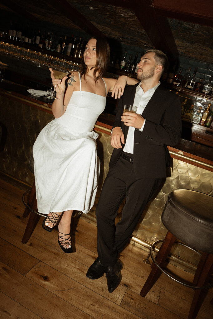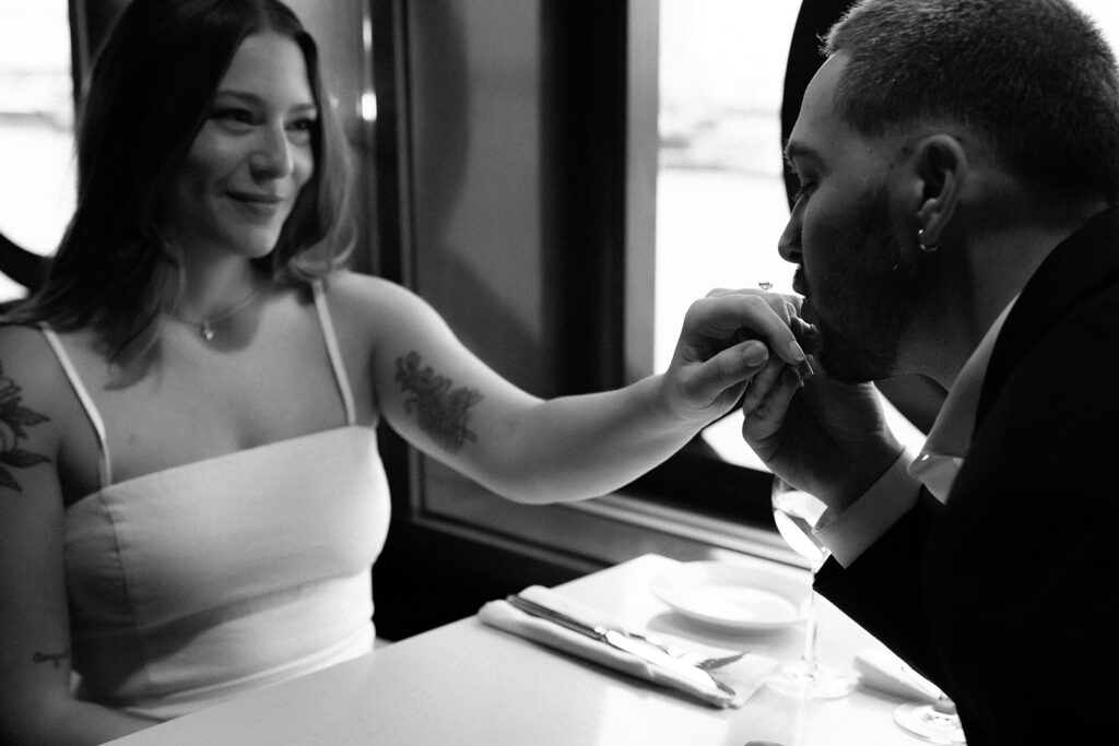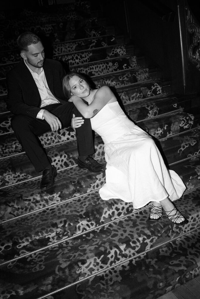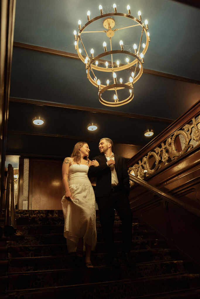 We had them get drinks at the bar and sit down at a table by one of the windows to enjoy each other’s company. I also had them dance a bit—him twirling her around. They both had so much fun during their session. They were very confident and happy to do anything the other person asked. They truly just wanted to make each other happy. We utilized almost every aspect of the ship. We found a cute nook where she could sit on the ledge and look out the window, and we did a few poses there that I loved. We also, of course, had to take photos on the staircase. This truly gave me all of the emotions and feels. They were so gentle and loving, and wanted their photos to reflect that! We eventually made our way outside, where it was gloomy and raining, but it was perfect for the mood we were going for! The couple brought an umbrella, and we incorporated that into the photos. This portion truly felt like you were taken back in time. It was perfect in every way.
