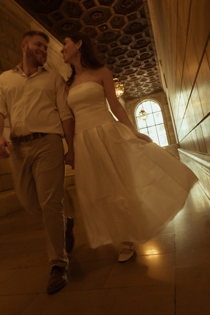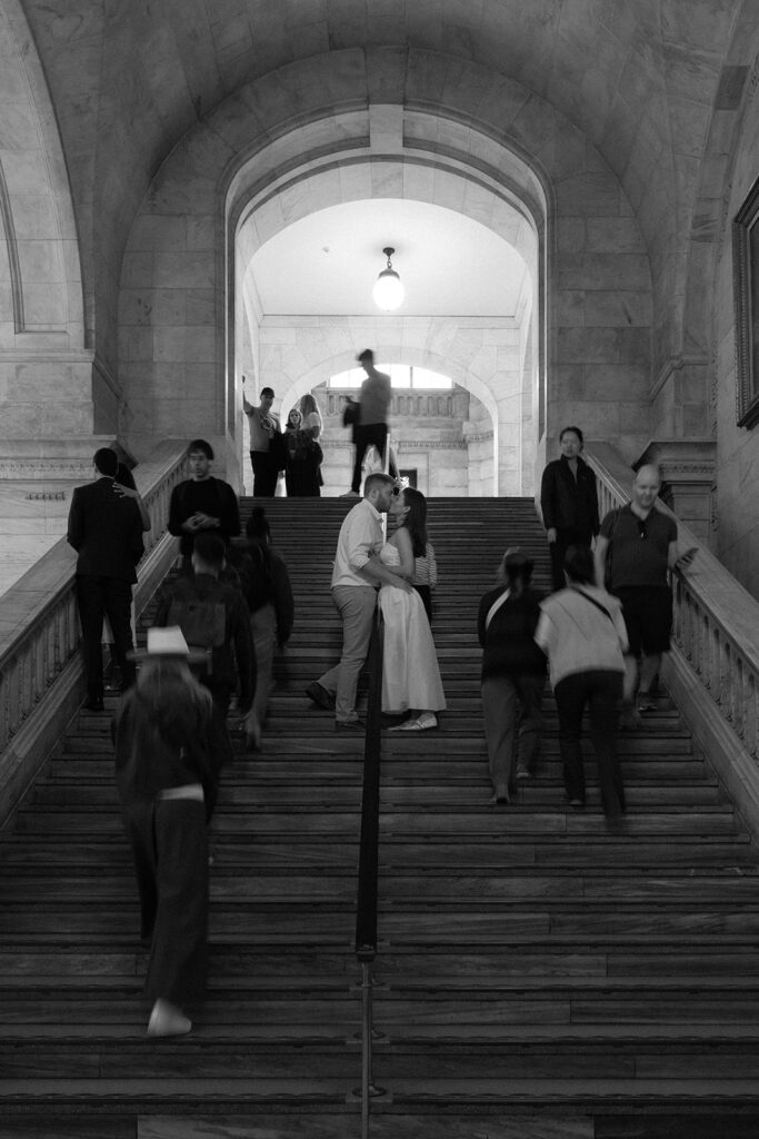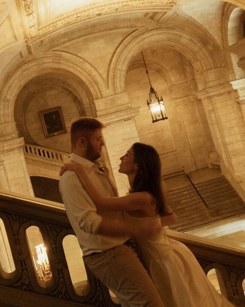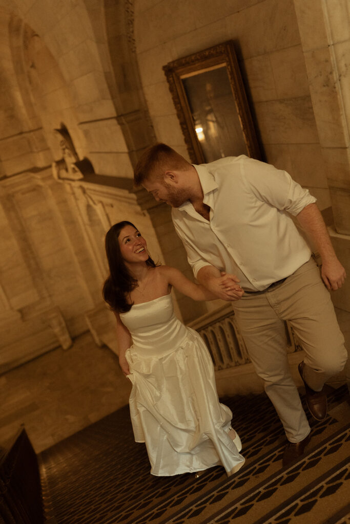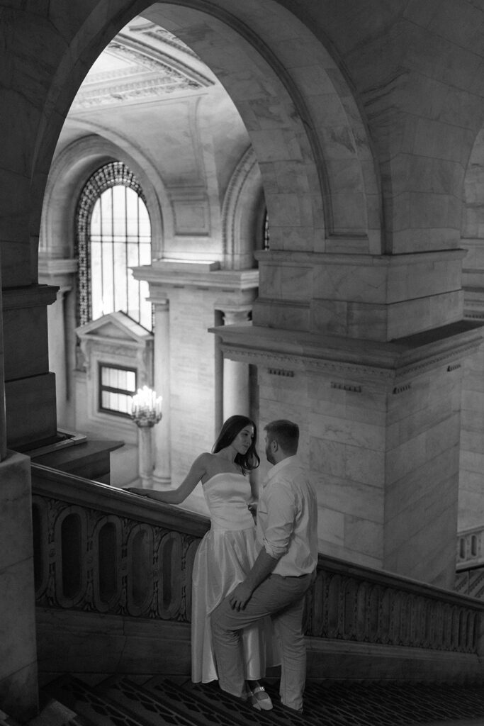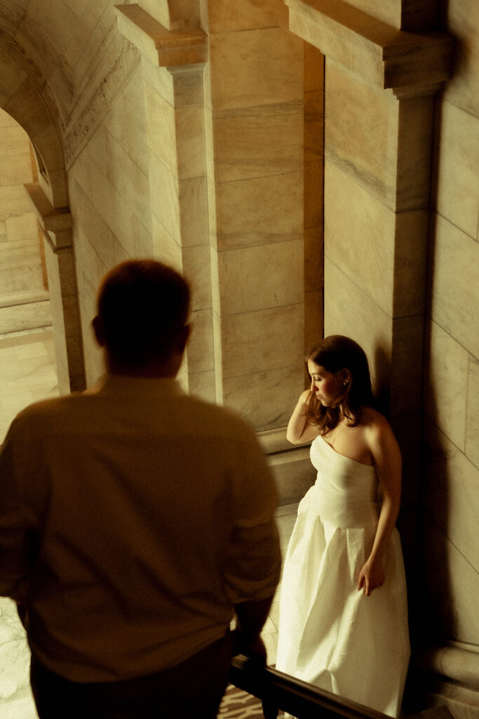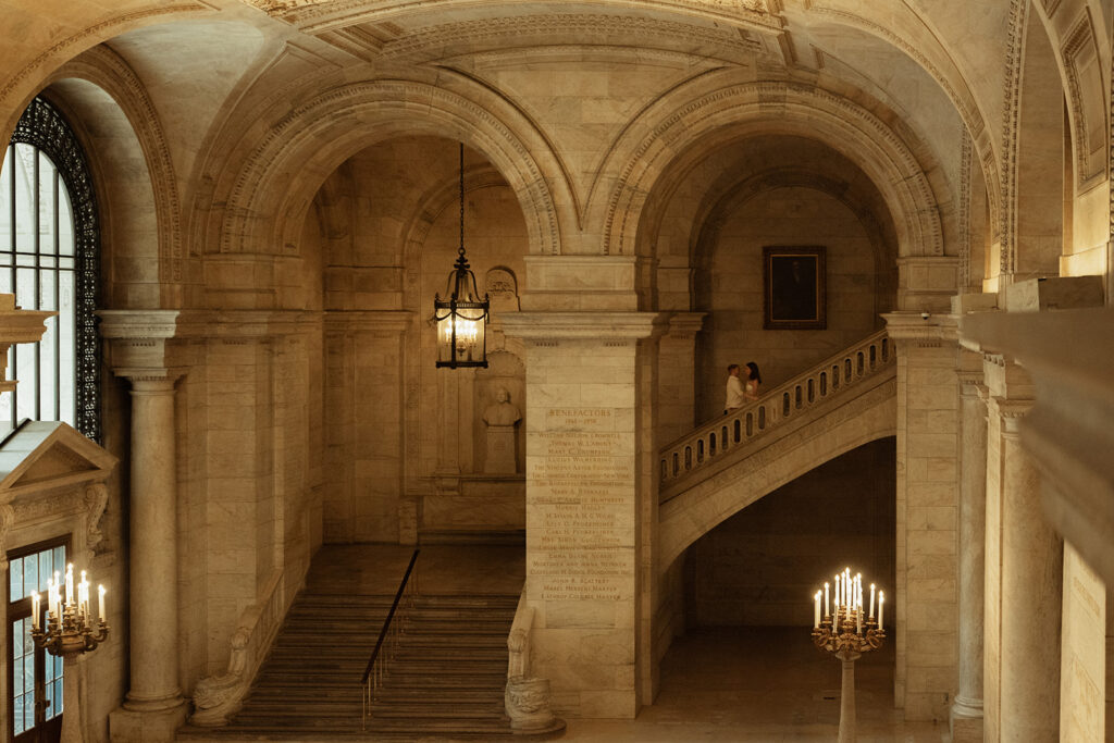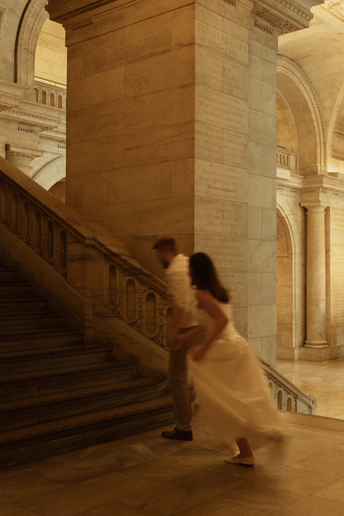 Their session started at the NYC Public Library – the bride’s dream location! They requested photos on the stairs, and we delivered with so many gorgeous shots. There were countless small nooks and open spaces to explore, so we never needed any props – the scenery spoke for itself! The architecture was intricate yet simply elegant. Even though it was gloomy and rainy in the city, we made the most of the natural light from the windows and embraced the moody lighting from the fixtures.