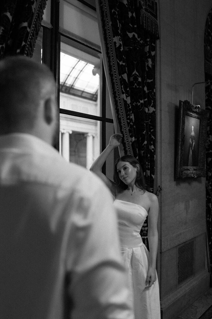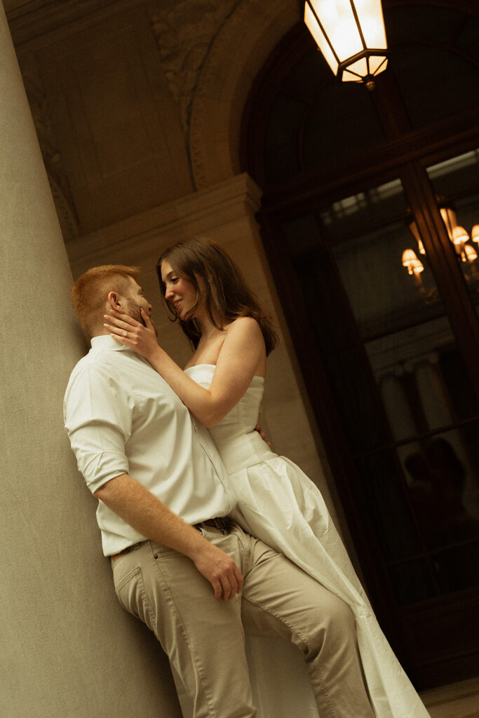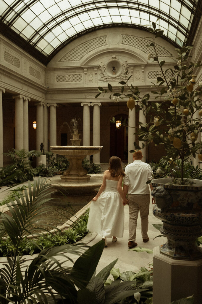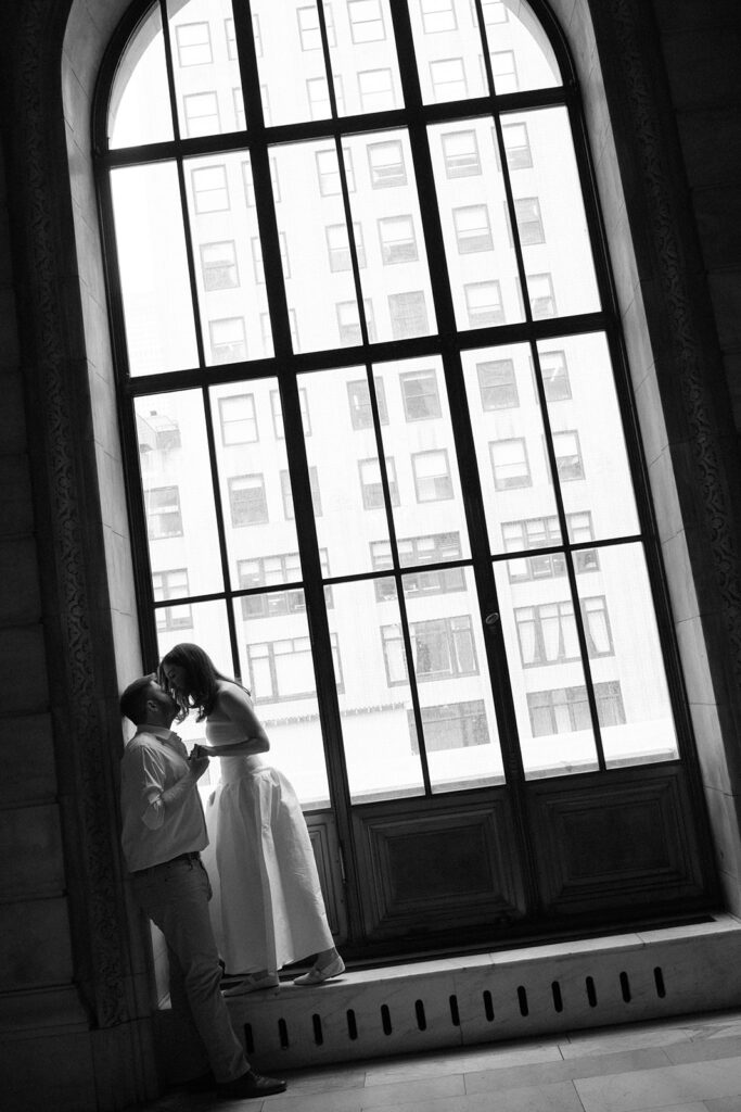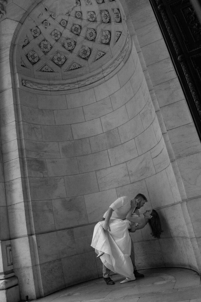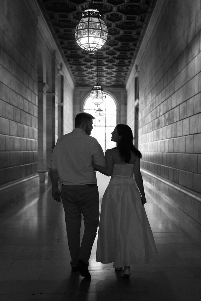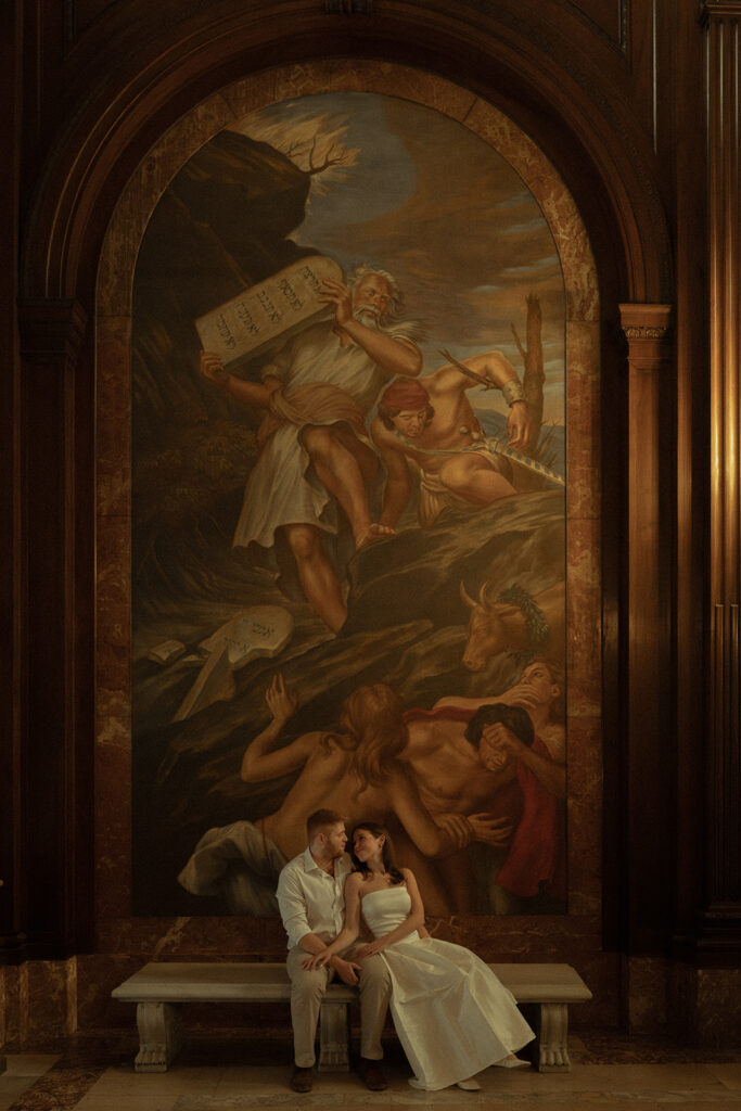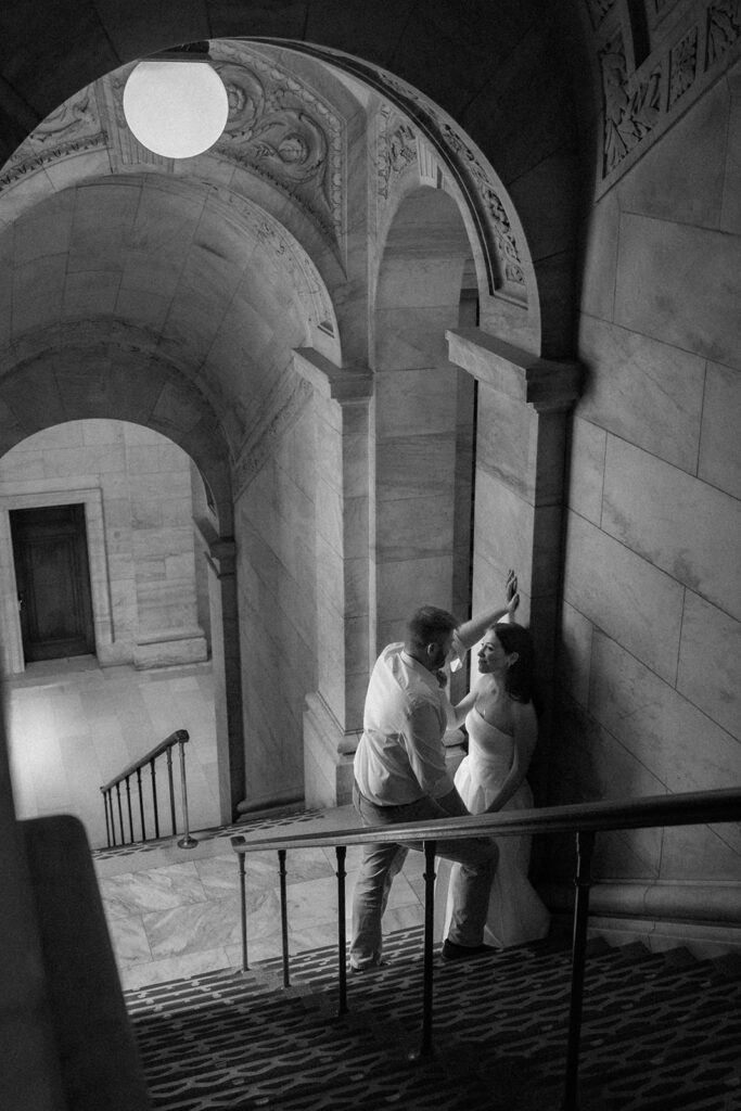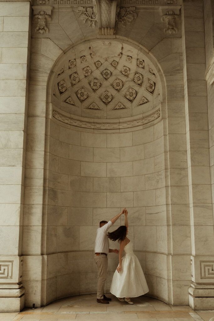 Their session started at the NYC Public Library – the bride’s dream location! They requested photos on the stairs, and we delivered with so many gorgeous shots. There were countless small nooks and open spaces to explore, so we never needed any props – the scenery spoke for itself! The architecture was intricate yet simply elegant. Even though it was gloomy and rainy in the city, we made the most of the natural light from the windows and embraced the moody lighting from the fixtures.
