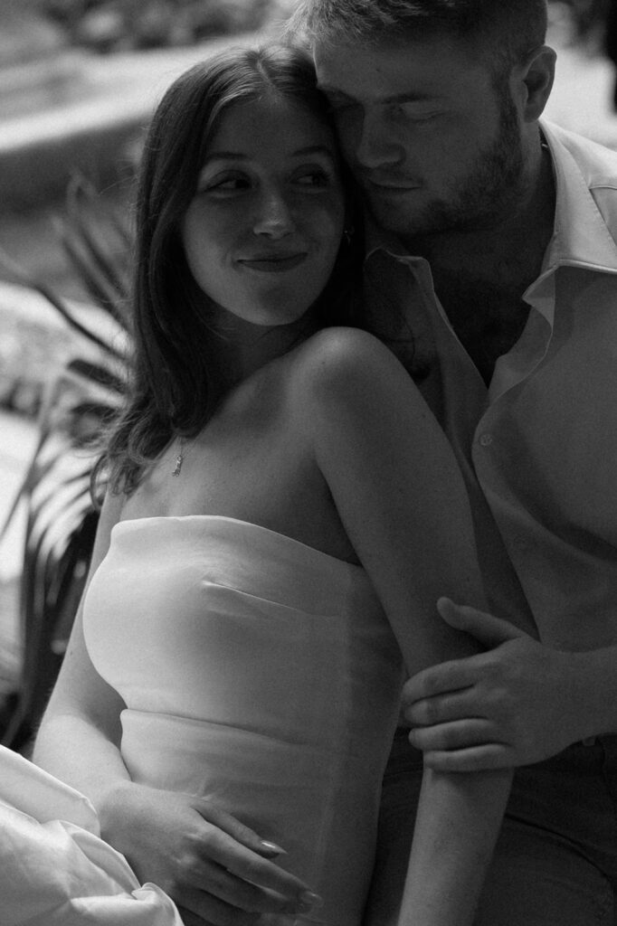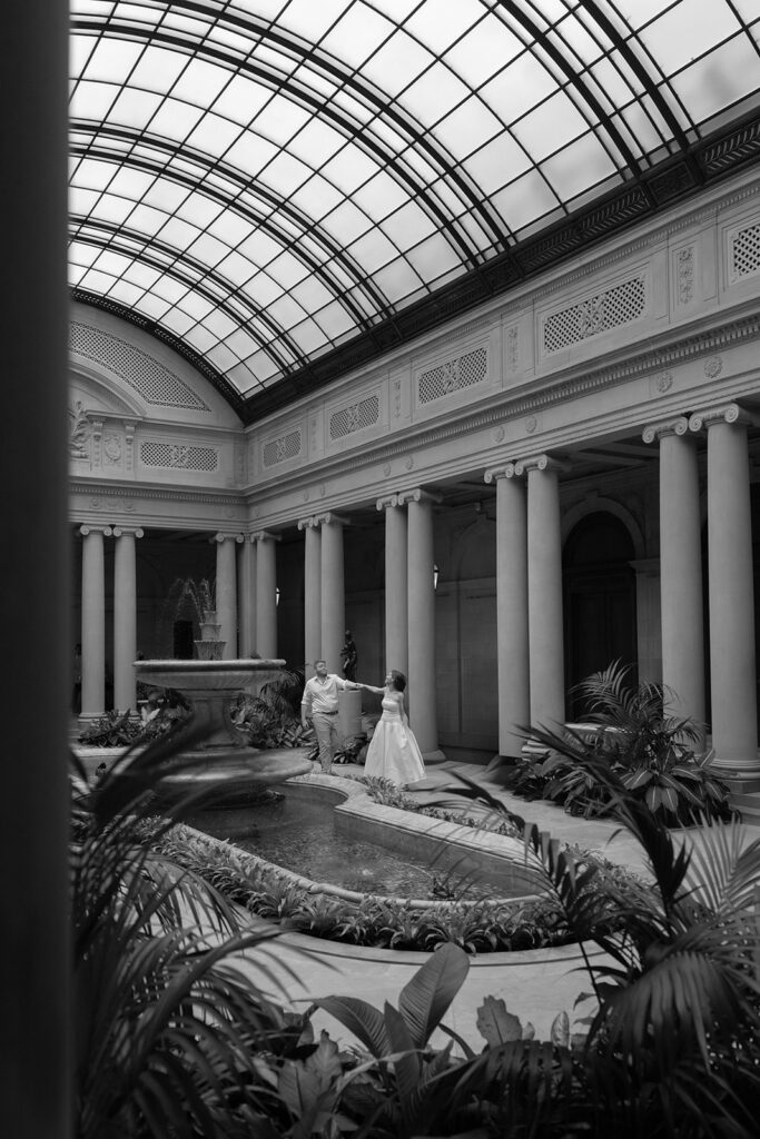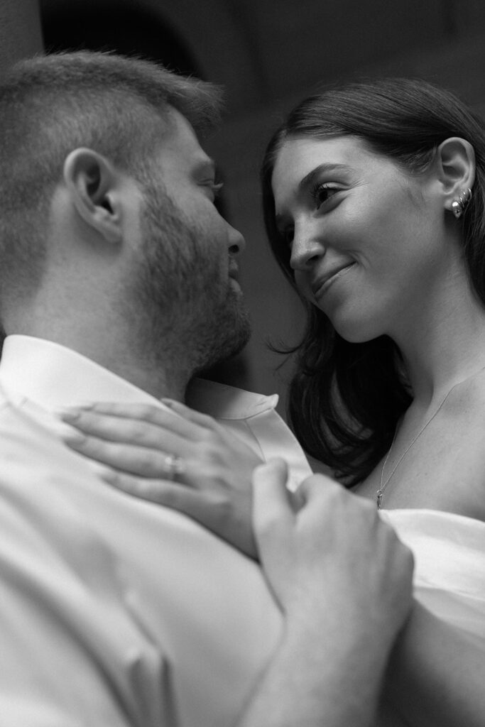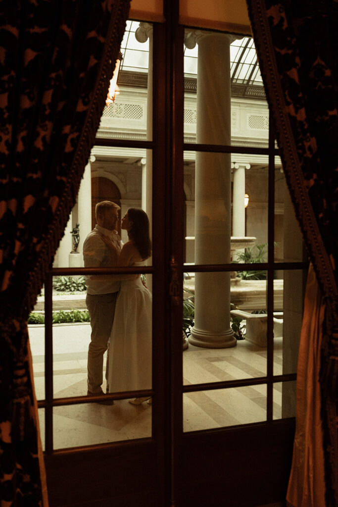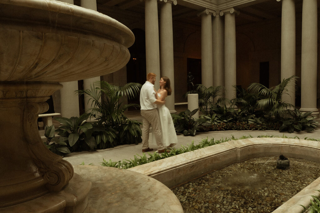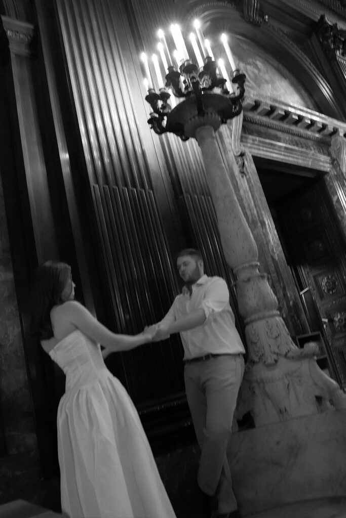 Due to the rain, we moved locations to the beautiful Frick Museum. Ashley & David have such an easy-going relationship and are very much go-with-the-flow themselves, so switching locations was no issue. Their whole day flowed beautifully, and they were able to read each other so well and anticipate each other’s needs perfectly. Just like the library, there were so many different spaces to capture photos. We stopped in this greenhouse-like room with a glass roof, greenery, and a fountain. We of course also had to take advantage of another stunning staircase – these shots were by far my favorite. I loved the candle-lit chandelier pillars and of course the ceiling; those really added to the cinematic feel of their photos. But more so, I loved the looks on their faces while capturing their love. The way they look at each other with such adoration was so beautiful. All they did was have fun and gush about their amazing relationship and future wedding plans. I cannot wait to spend time with them again on their big day!