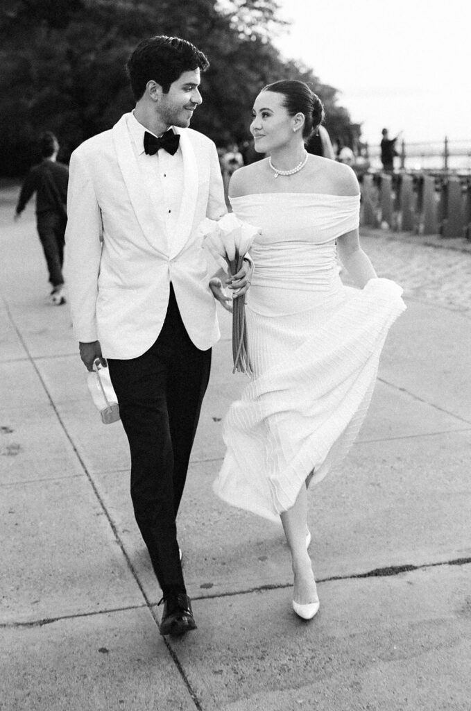 The walk to the intimate dinner celebration might have been one of my favorite parts. There’s nothing quite like seeing newlyweds stroll through NYC streets while strangers stop to congratulate them! We made a quick detour to the Promenade, catching the most beautiful sunset photos with the city behind them.