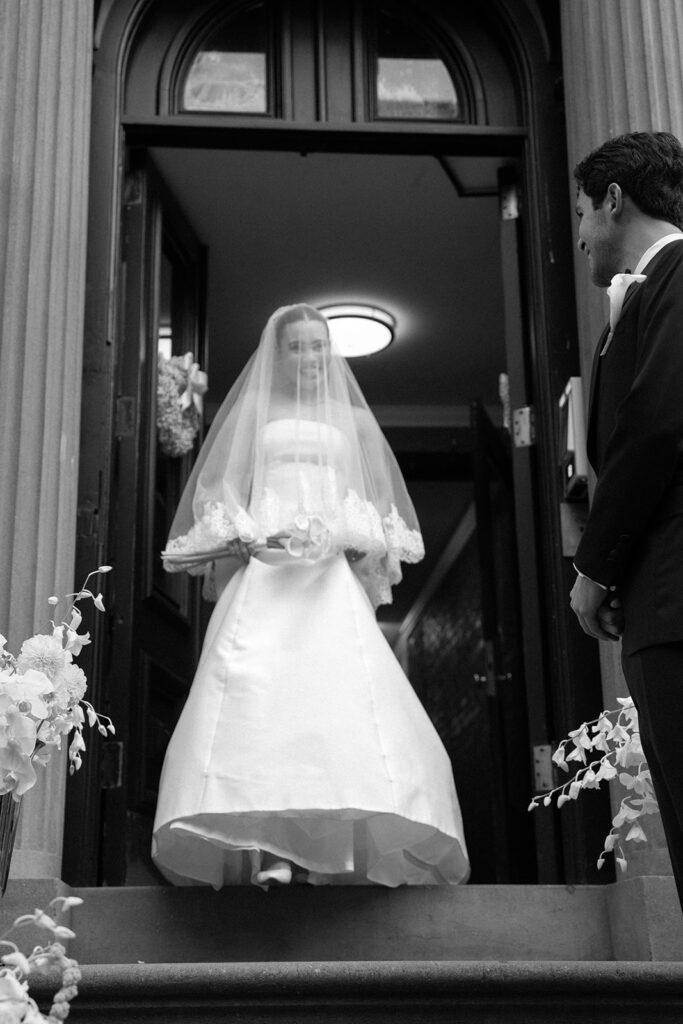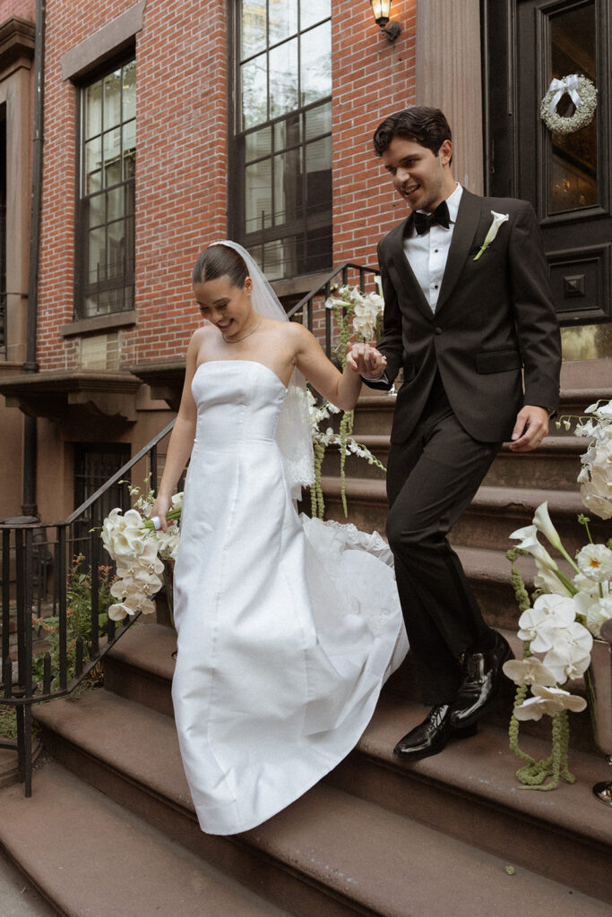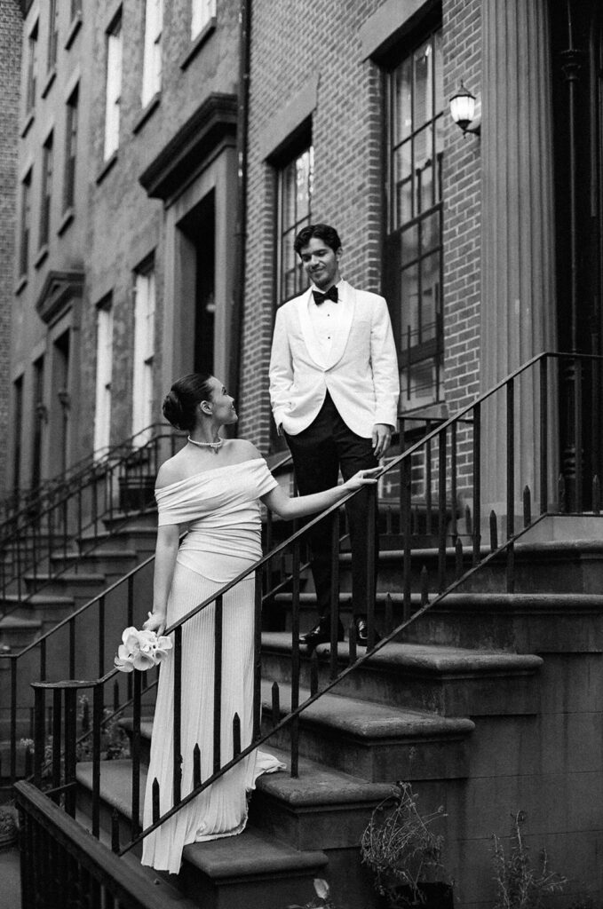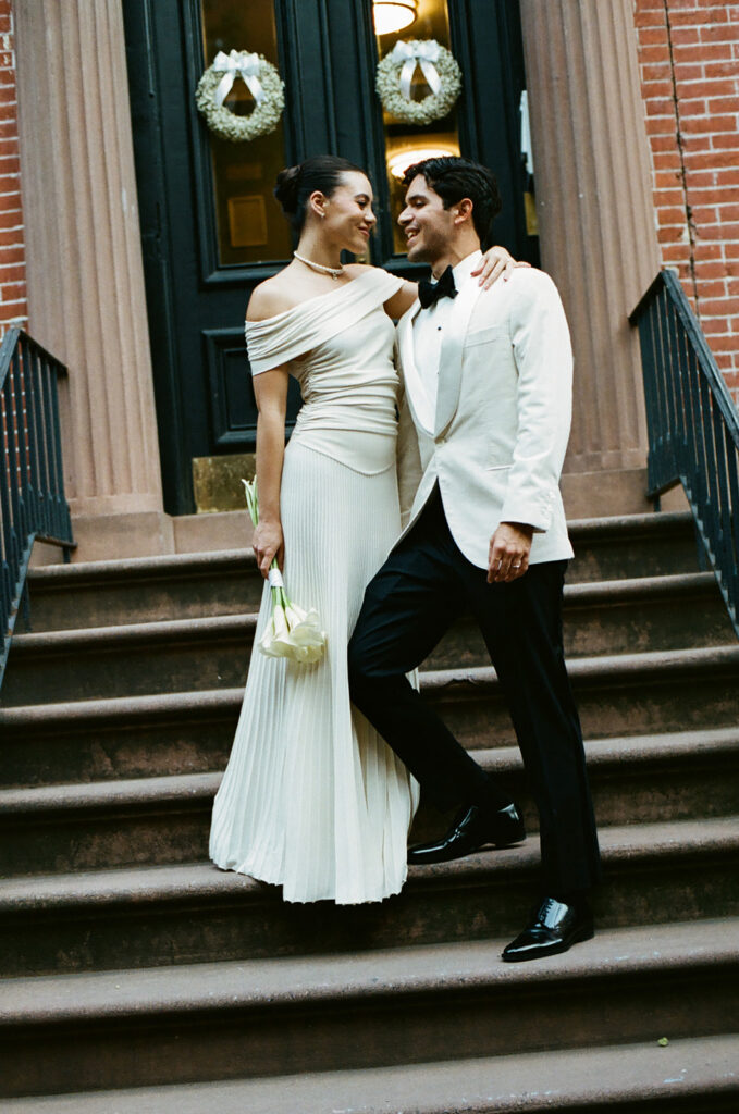 We then moved into bride and groom portraits. Emily specially requested photos of them running down the stairs together after saying “I do” – these perfectly captured that NYC wedding style they were going for. After getting all the classics, they both had an outfit change – Emily into an ivory dress and Santiago in a matching ivory suit jacket. We recreated some of those special moments in their new looks before heading to the restaurant.