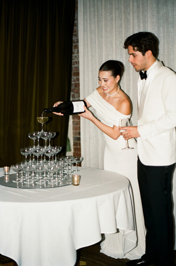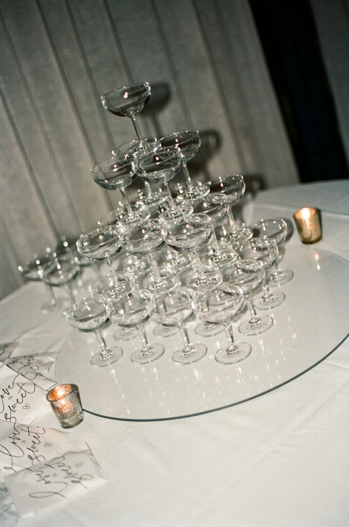 The private room was beautifully decorated with white tablecloths and flowers from the ceremony, plus touches of black and red to give that bold and classy vibe. And of course, they had the classic champagne tower, which is always awesome to capture!