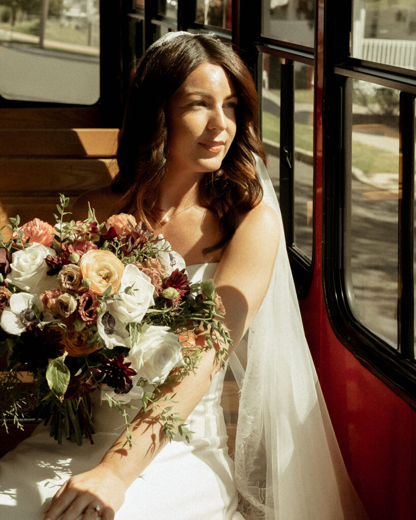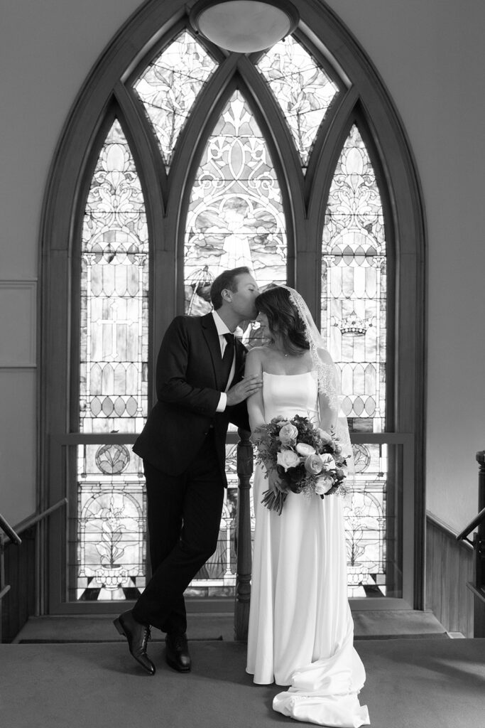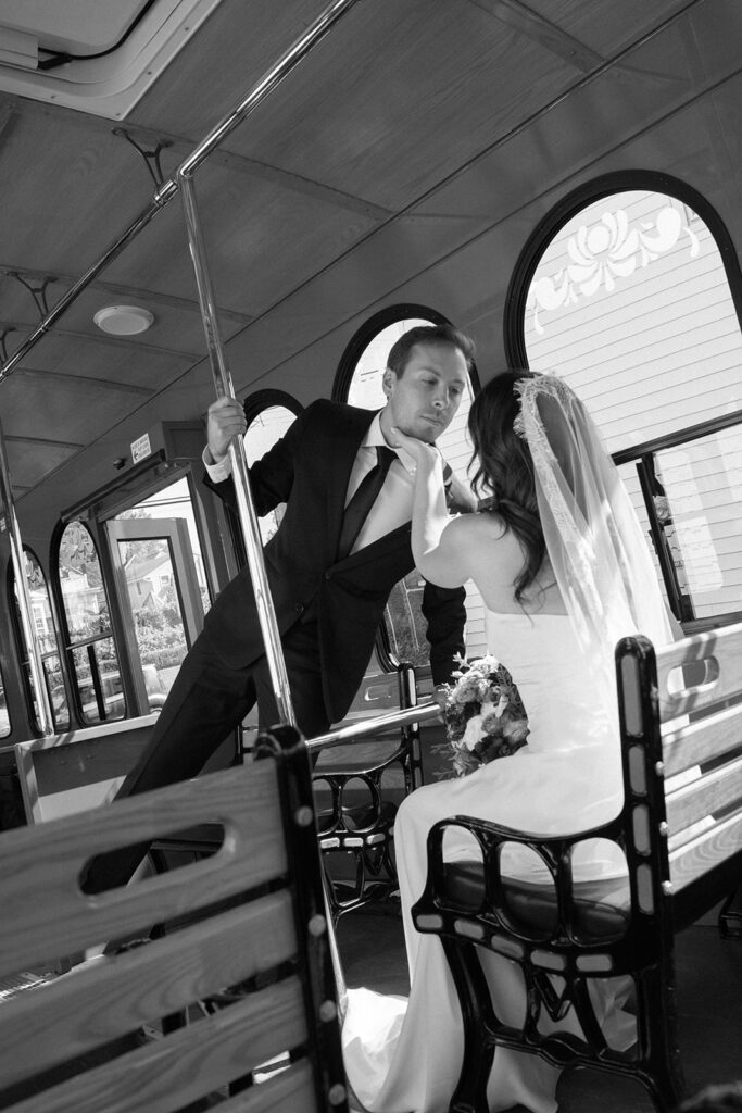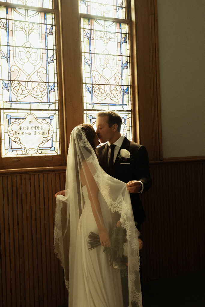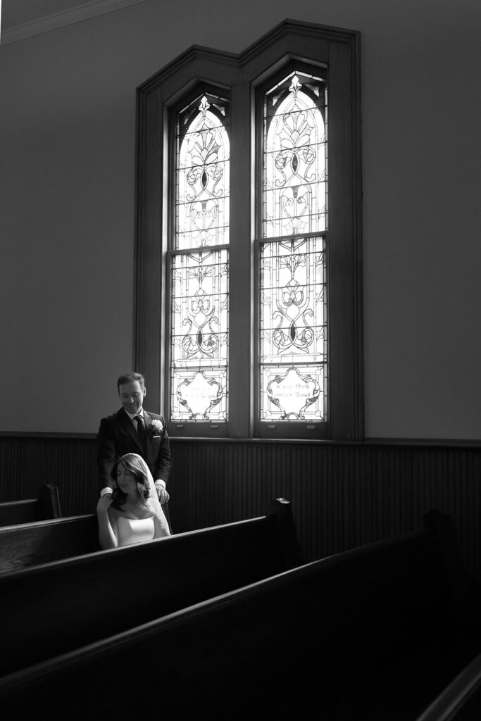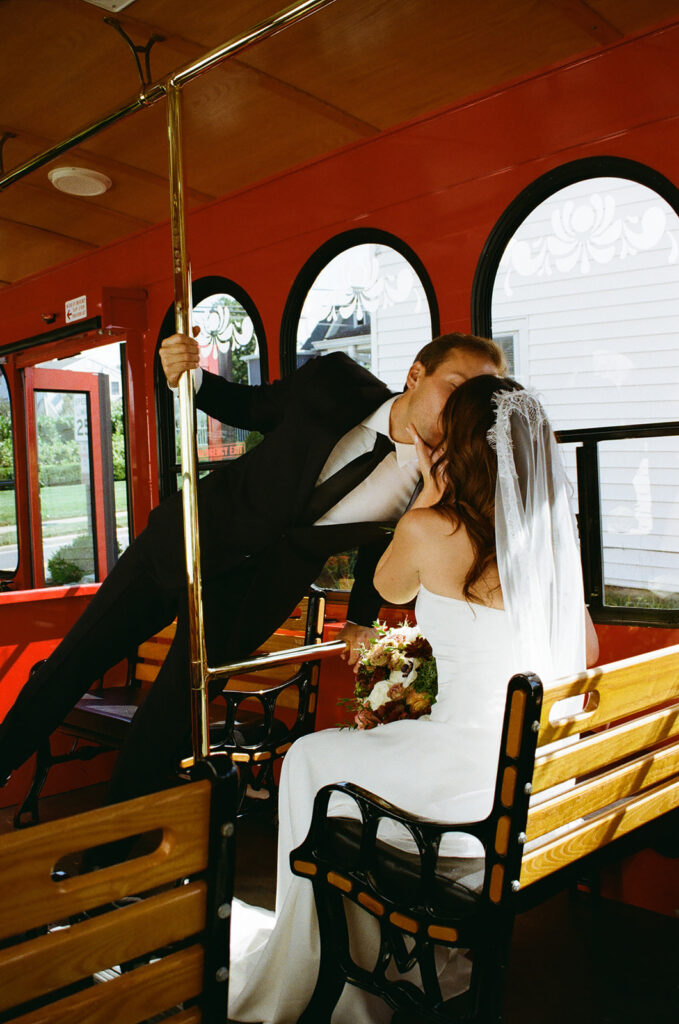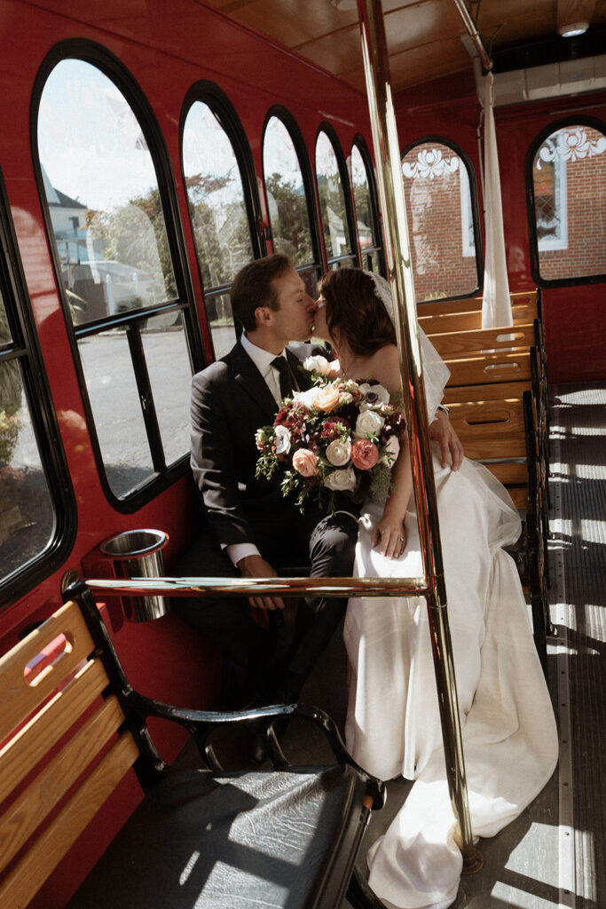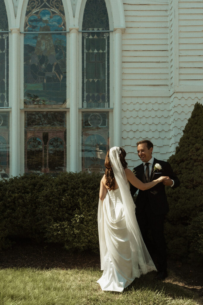 Once we arrived at the church, they did their first look right out front. The scenery was perfect. The First Baptist Church of Manasquan is absolutely beautiful—it really elevated their photos and added that extra touch. Their first look was so sweet, and Christian was just so smitten with her. You could almost feel his emotions through the camera. I loved how we shot their portraits because we played around with movement in her veil and dress, as well as using the natural sunlight to make them stand out. We had multiple locations for their portraits, one of them being the trolley! This was such a fun way to add a personal touch to the album and a really nice vintage element. Inside the church was even better. There was this huge floor-to-ceiling stained glass window that I had them stand in front of. I also really loved the photos of her sitting in one of the pews while Christian leaned in for a kiss!