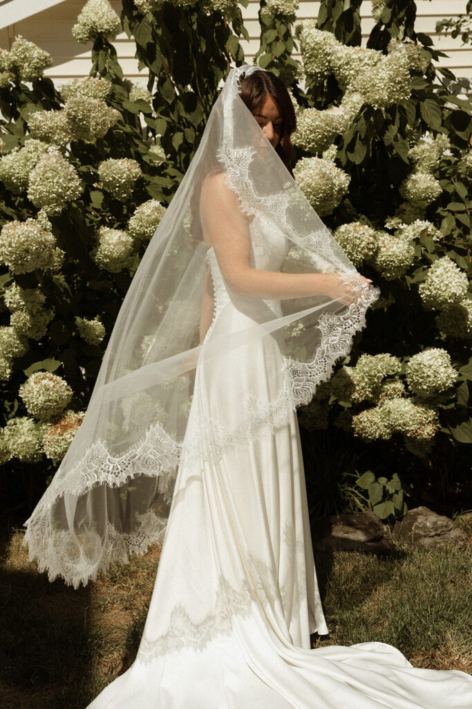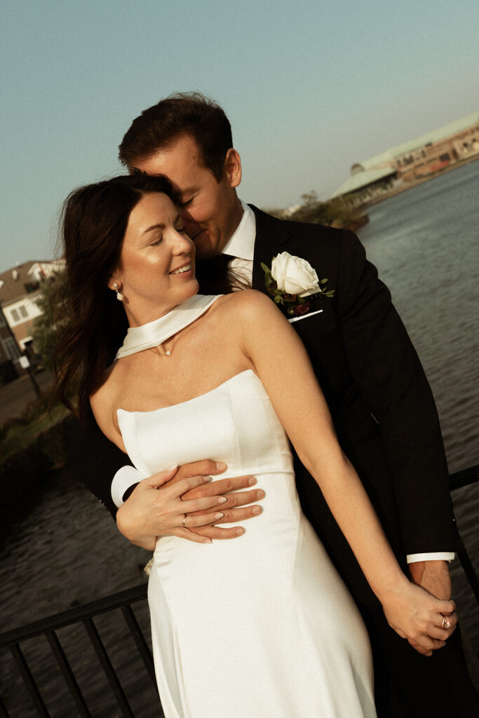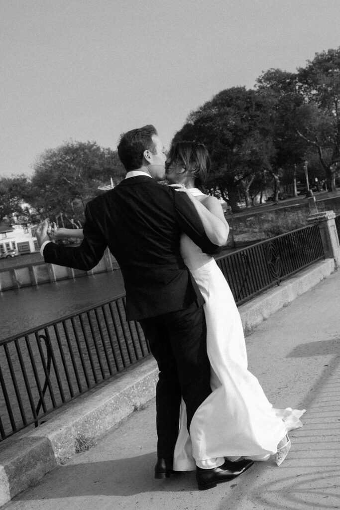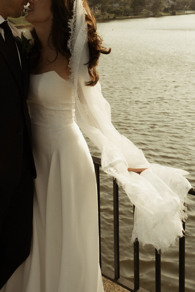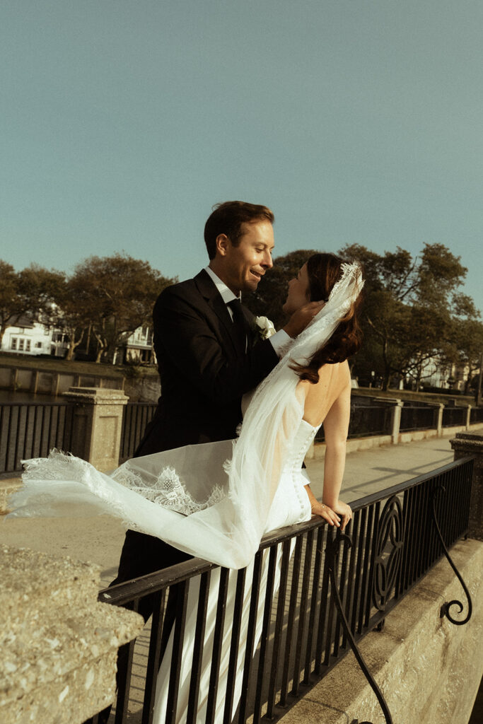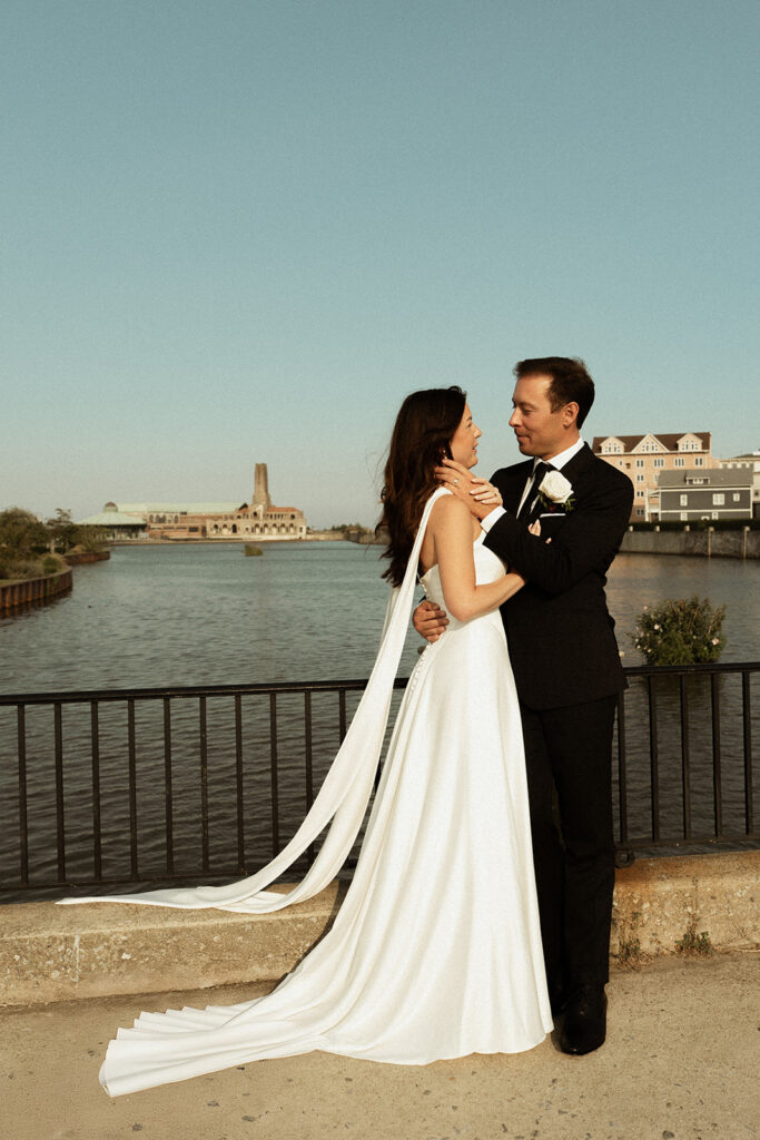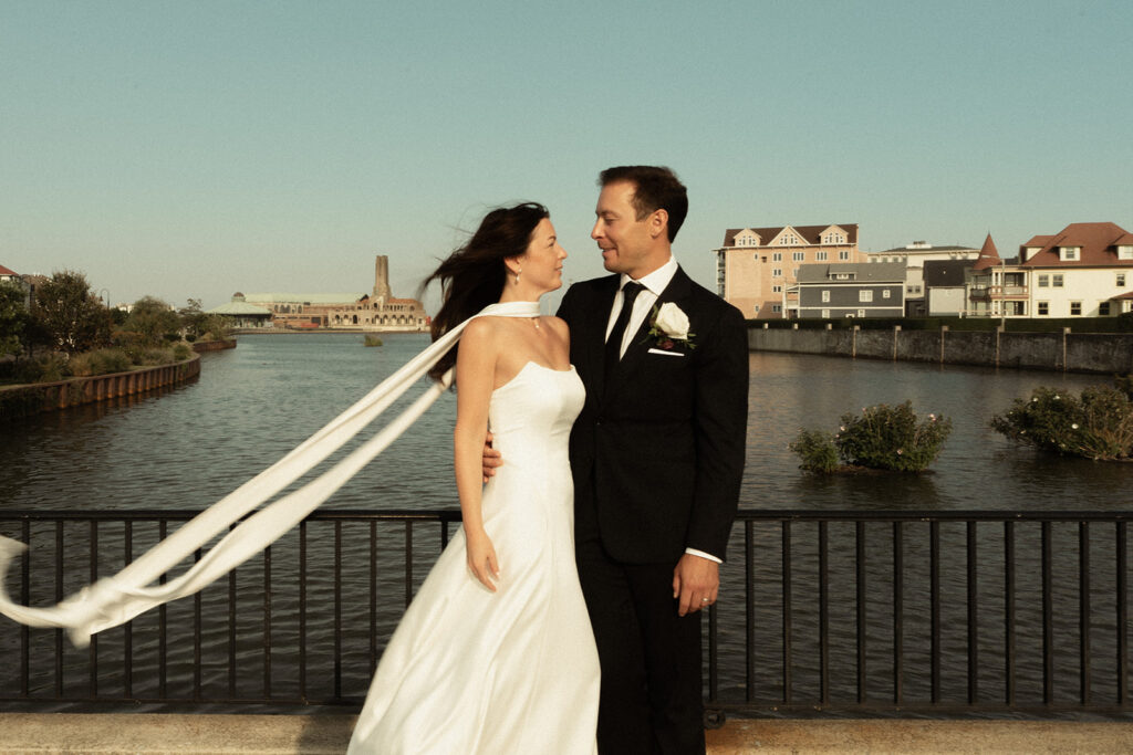 As the trolley dropped us off at the reception, we stopped to take a few portraits by the water. There was a small bridge that we incorporated into the photos, using the railing for certain poses. Danielle’s dress was absolutely perfect for the occasion. Her dress, veil, and scarf all blew so perfectly in the breeze—I loved all of the movement it gave to their gallery.