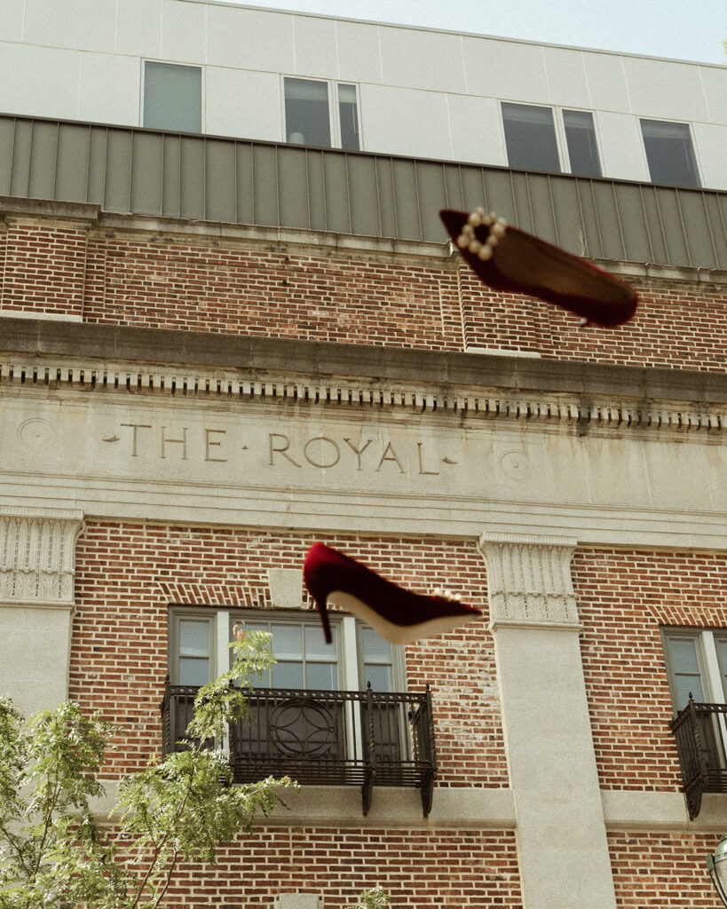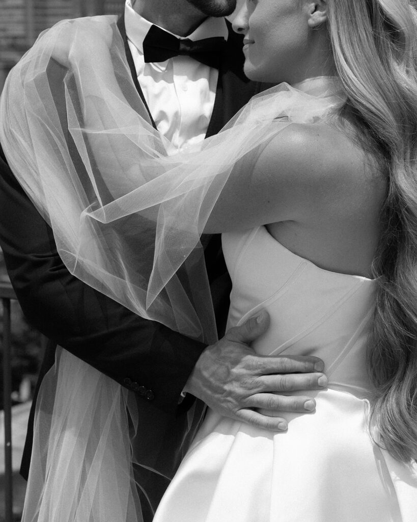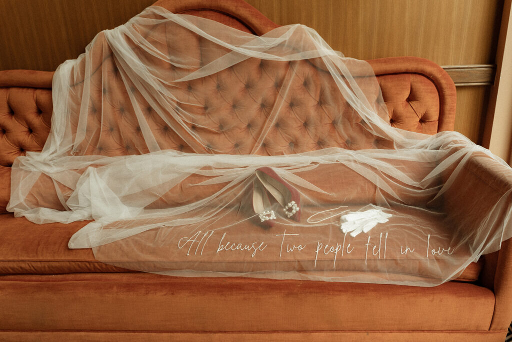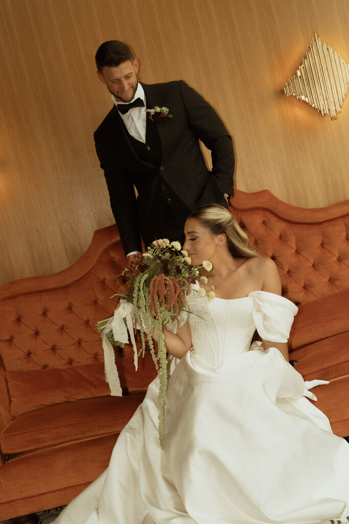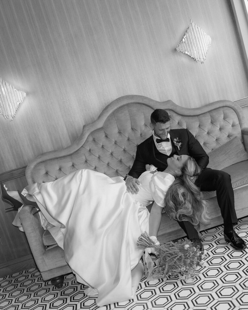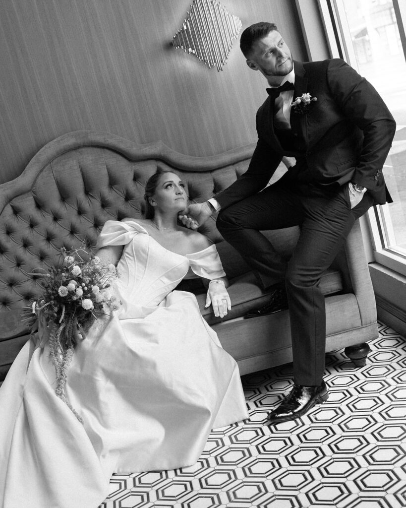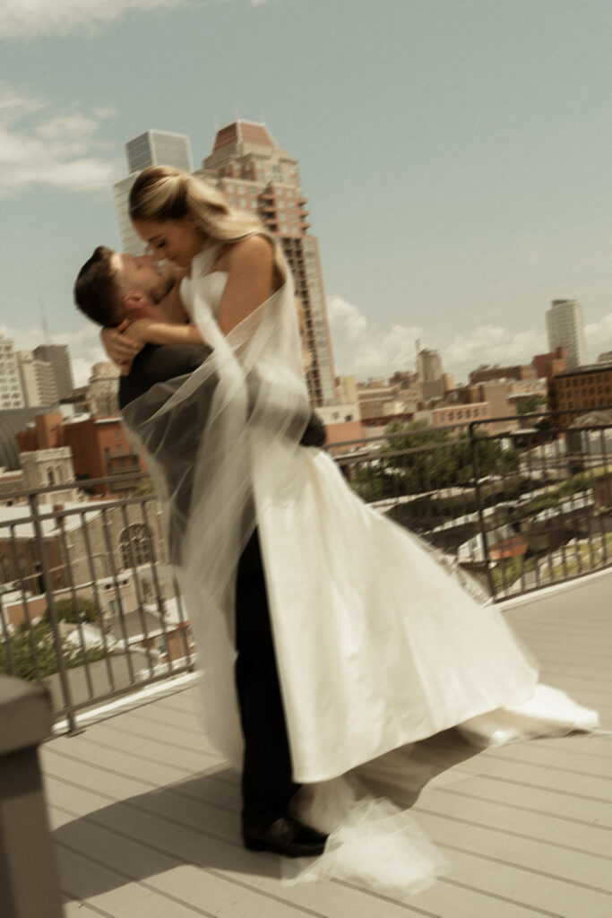While the lighting was still good, I took the couple out on the rooftop to capture them with the city in the background. I loved the movement shots with her veil blowing—those are always my favorite to capture. I also loved the photos of them posing on the couch, which is really where we started to get into the more editorial posing. We even played around with some props for this as well.