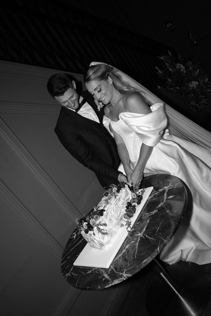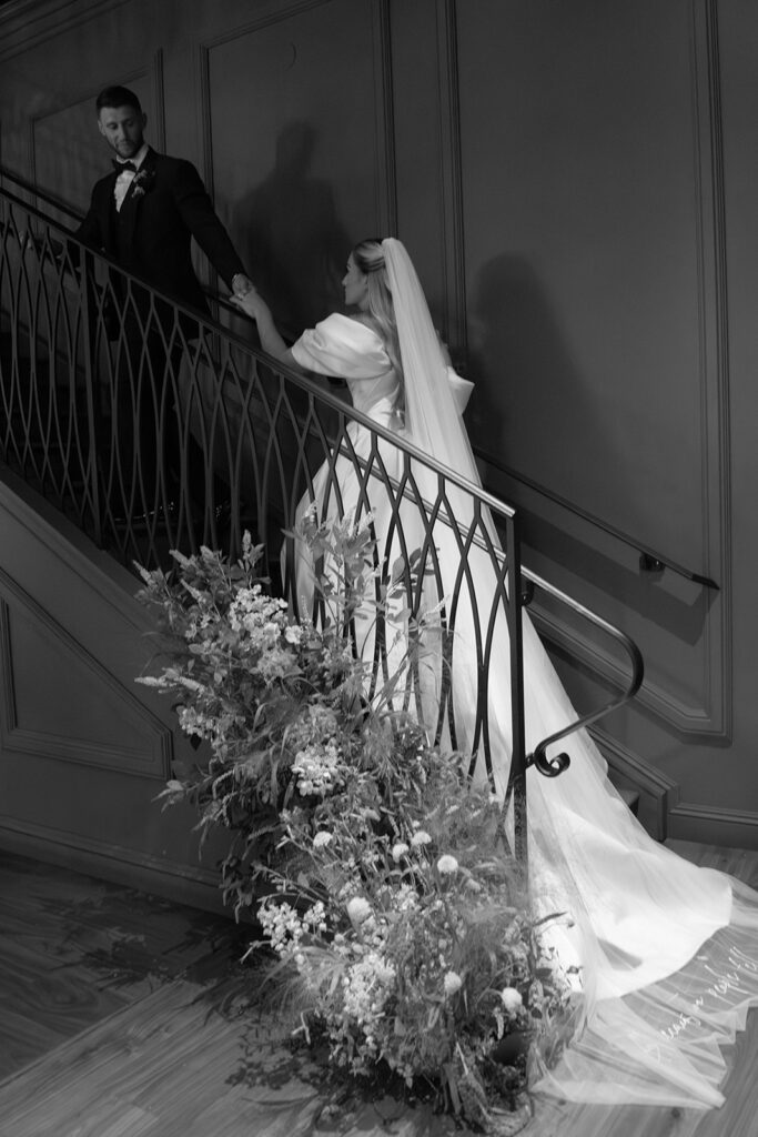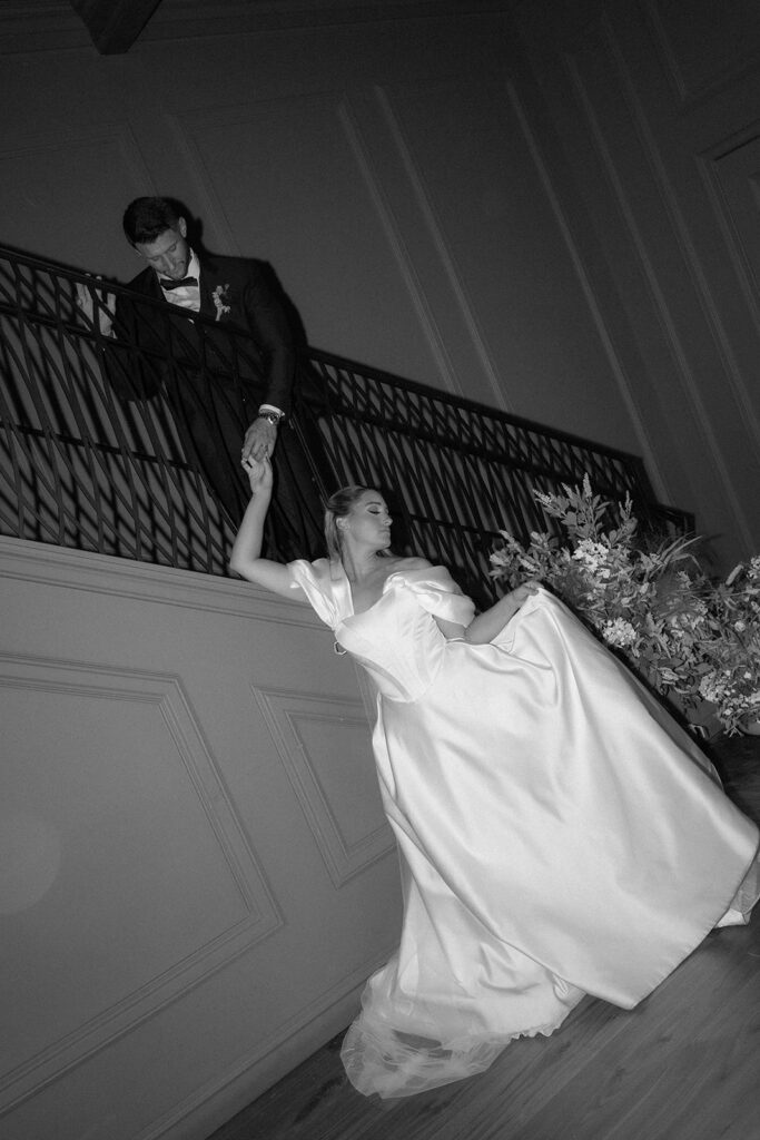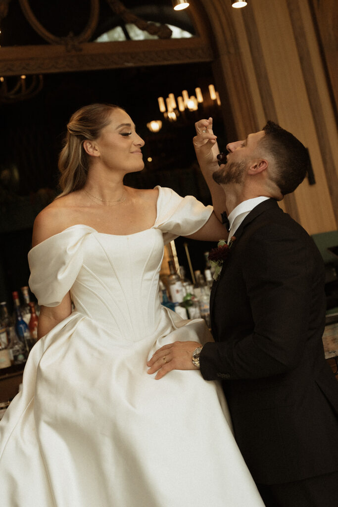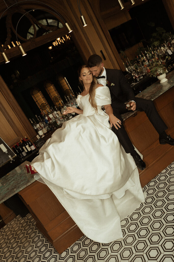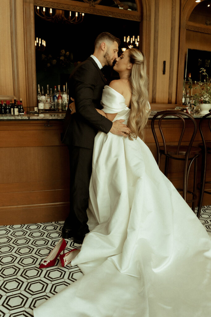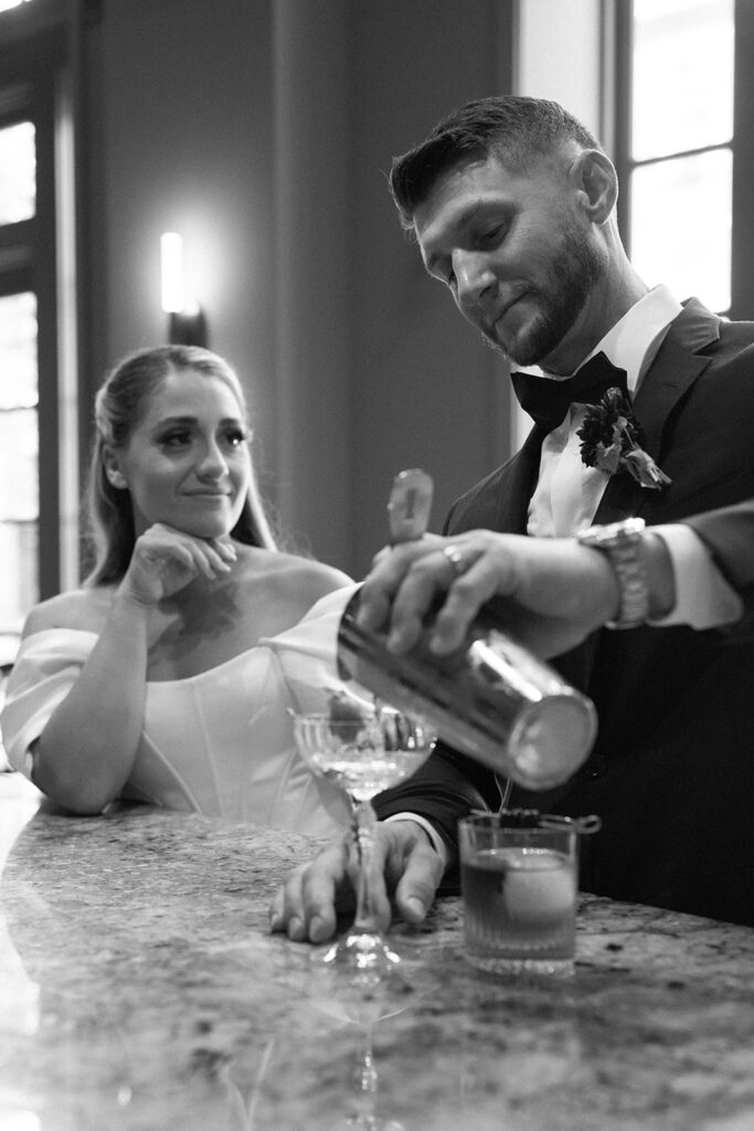 We moved on to the bar where I prompted them to make a drink and share it together. These photos are perfect for couples who maybe want some private photos resembling their cocktail hour at their wedding. Then it was time to move into the main room, where we had the most stunning florals hanging from the balcony and a beautifully decorated table with more florals, candles, fresh fruits, and yummy desserts. I captured so many sweet moments between them—sharing kisses, him kissing her hand, her gorgeous veil draped perfectly on the floor. I really loved incorporating the balcony and the stairs into the photos. We got a lot of editorial moments from that but also documentary style as well, with tons of in-the-moment photos including their cake cutting!