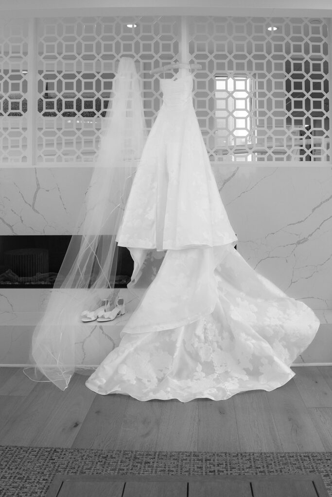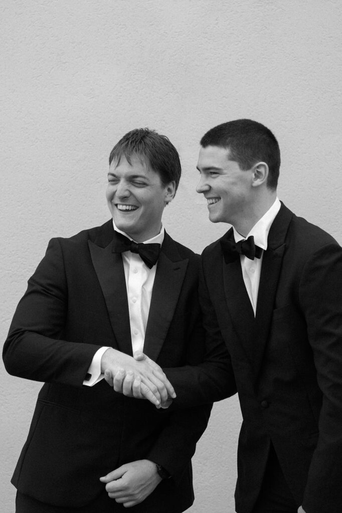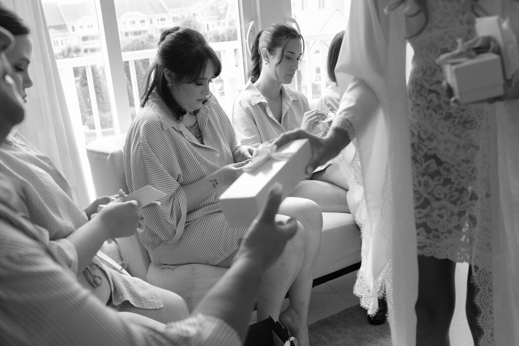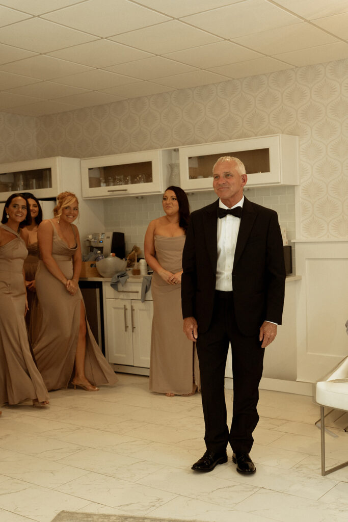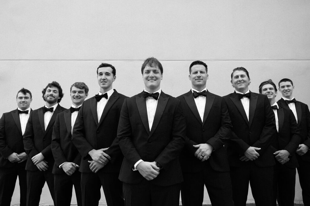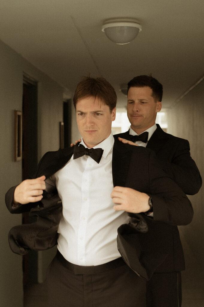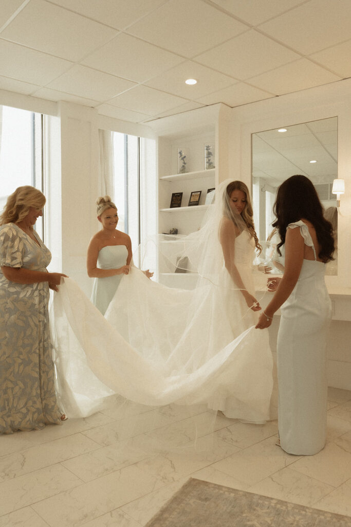 The couple got ready separately at the venue’s on-site hotel. They both had huge bridal parties that were so much fun to be around! I captured so many sweet moments—from the girls getting their makeup done, exchanging gifts, and having a toast, to helping the bride with her finishing touches. I even snapped a few photos of the bride attaching a pin of someone special on the inside of her dress. We took the guys out to the balcony for their photos, where I got some cool shots of the groom receiving help with his own finishing touches, plus plenty of documentary-style, candid moments of them having a drink and enjoying fun group photos.