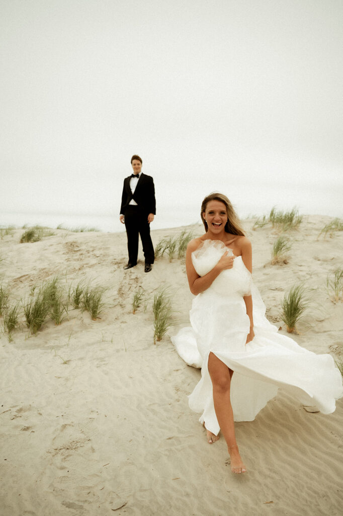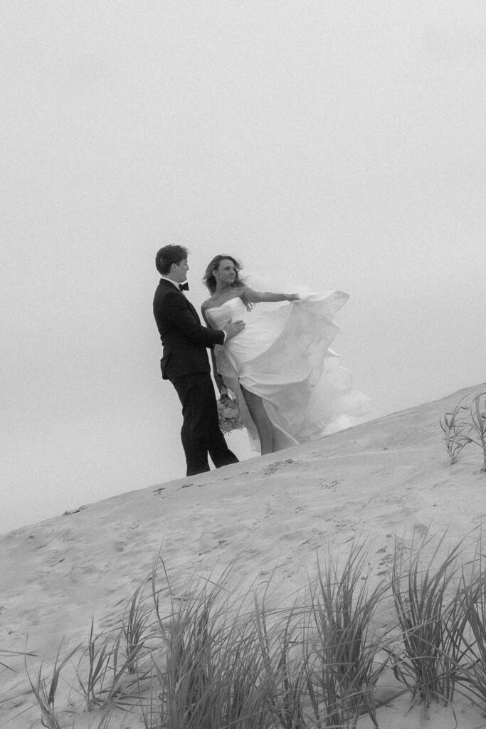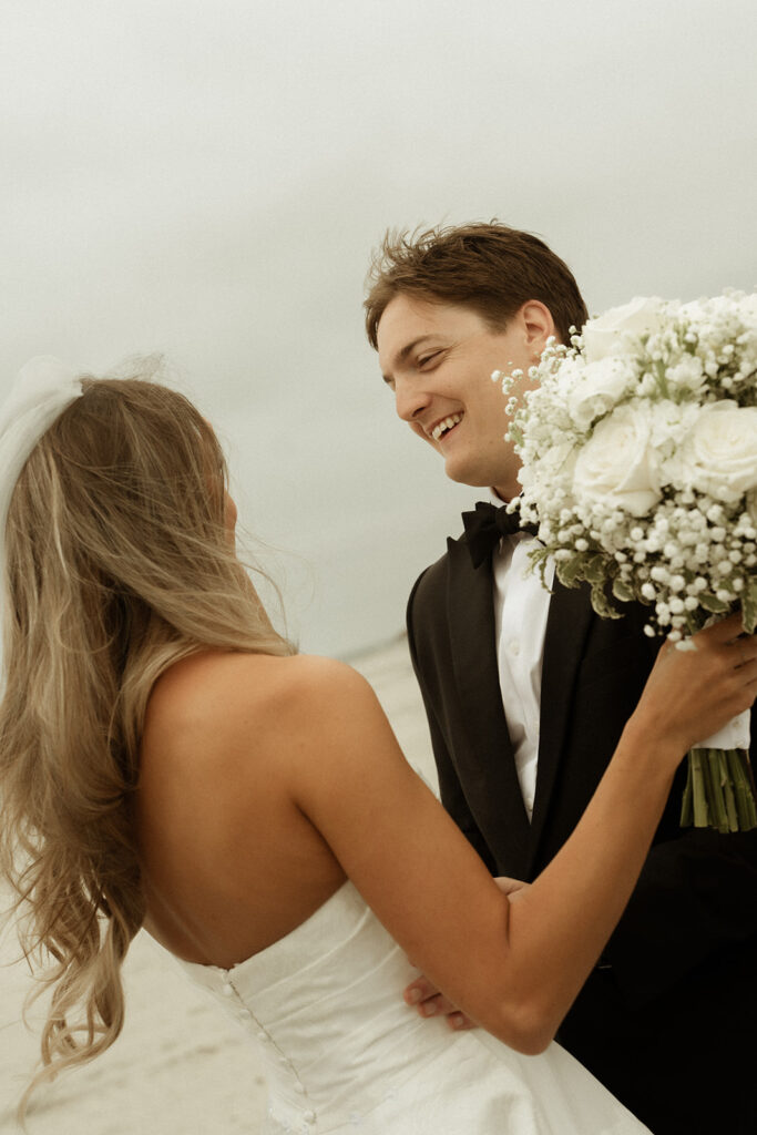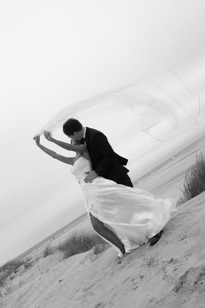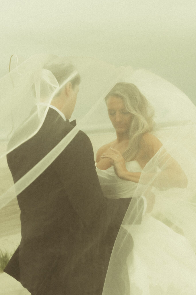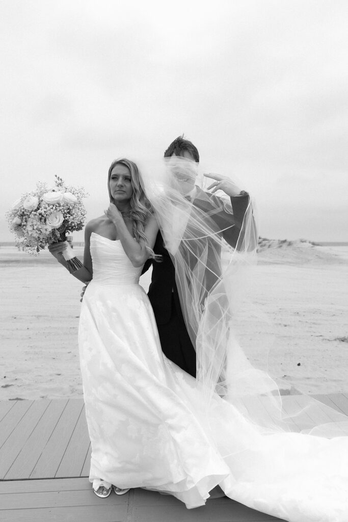 After the ceremony, we snuck away to take some bride and groom photos. We started on the beach, where it was still very windy, so Jordan’s dress and veil looked so stunning and flowy in the wind. Her veil actually kept blowing in Nick’s face, so we intentionally put the veil on his face for a funny photo. I love moments like this with couples because even though it’s not a traditional photo we planned for, it will be a memory they’ll look back on and smile.