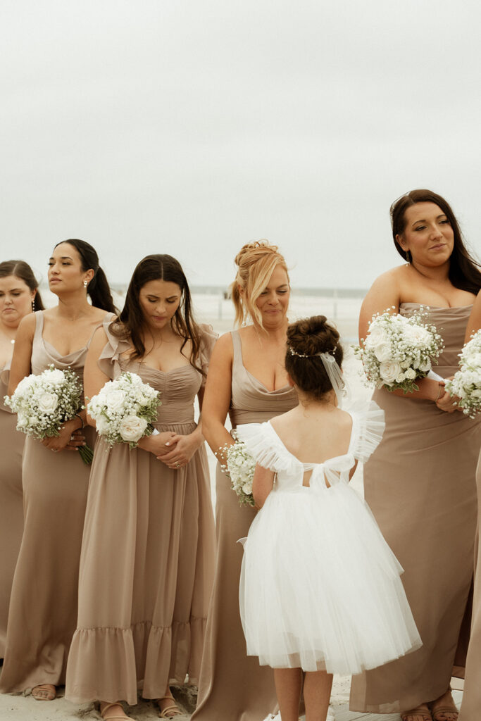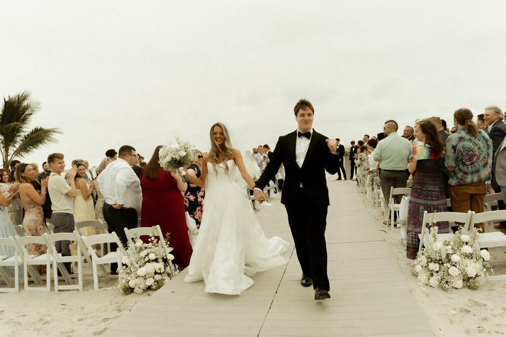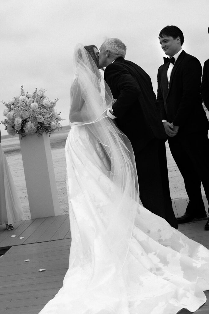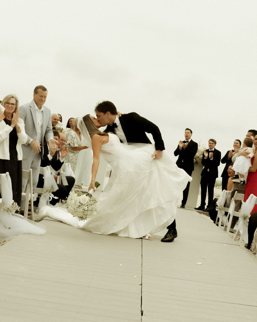 Their ceremony was right on the beach. It was overcast and a little windy, but I actually thought the wind made it so beautiful! Watching her walk down the aisle felt so grand because of all the open space, and it was amazing with her veil blowing in the wind. My favorite moment of the ceremony was when they did a prayer over the couple—their guests put their hands towards them, and it was so heartwarming.