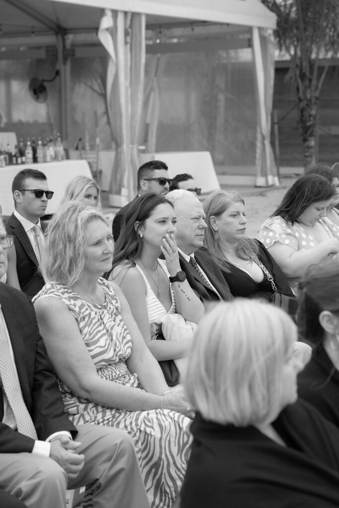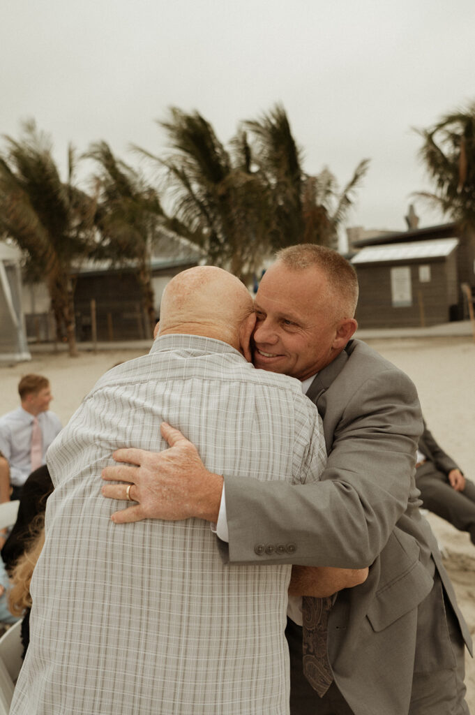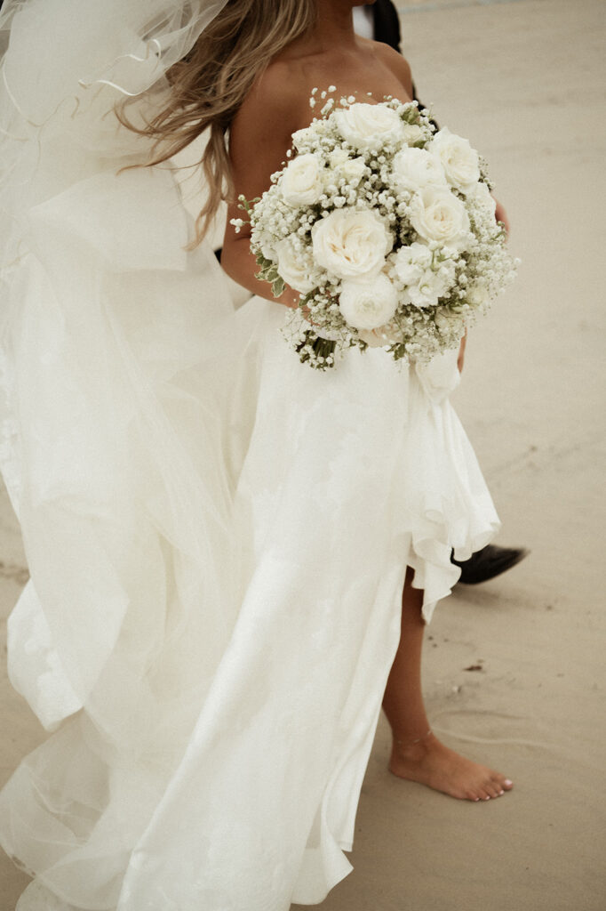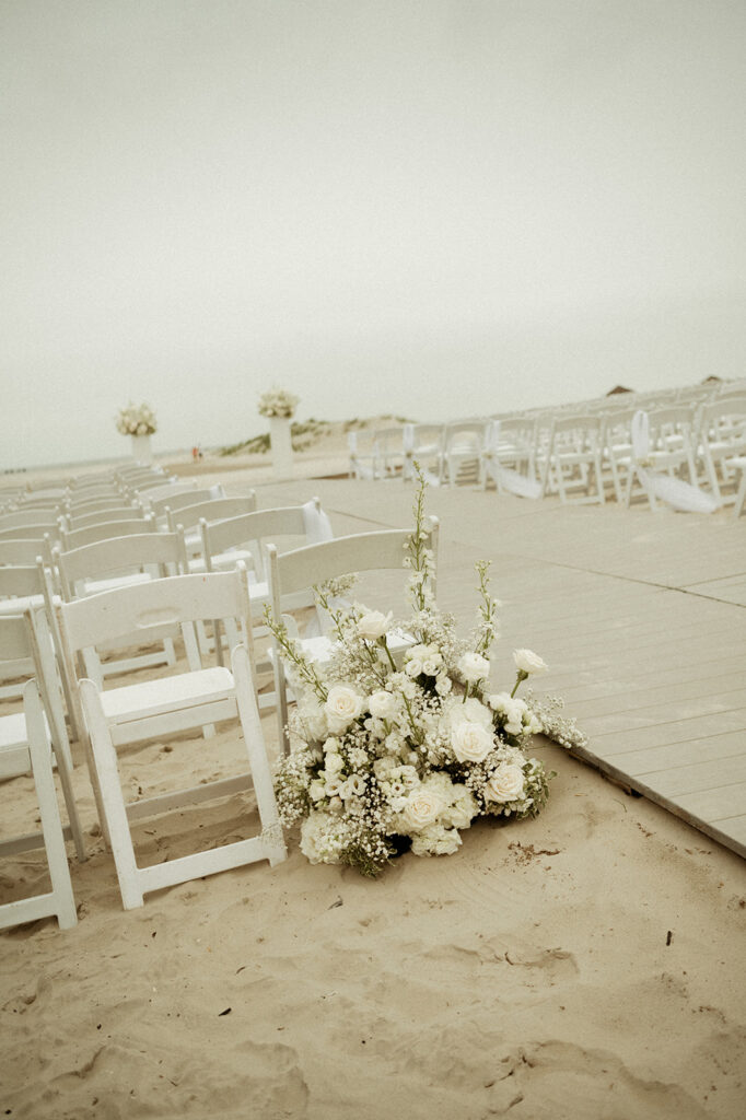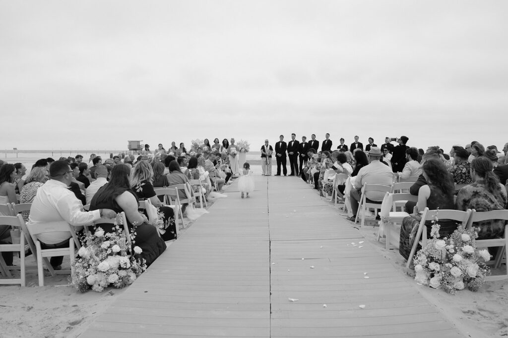 Their ceremony was right on the beach. It was overcast and a little windy, but I actually thought the wind made it so beautiful! Watching her walk down the aisle felt so grand because of all the open space, and it was amazing with her veil blowing in the wind. My favorite moment of the ceremony was when they did a prayer over the couple—their guests put their hands towards them, and it was so heartwarming.