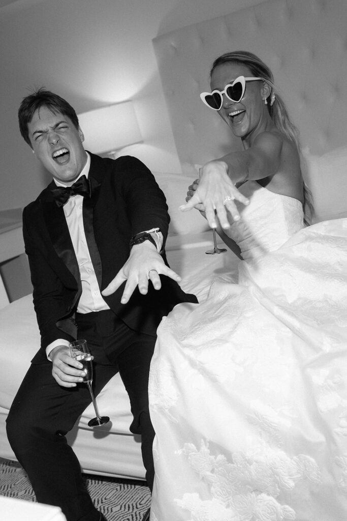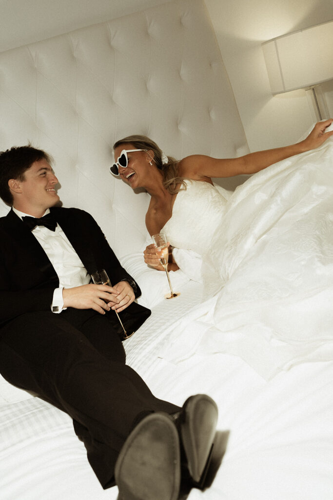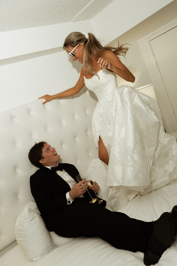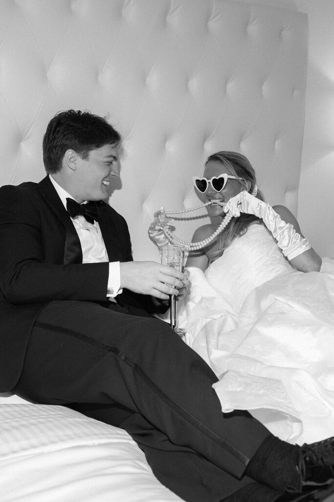For the second half of the photos, we did super fun flash photography in their hotel room later on in the day. We incorporated some props, like sunglasses for the bride and champagne. It was very lighthearted, and their personalities really shone through the photos.