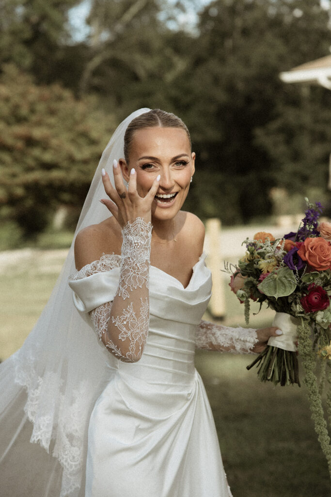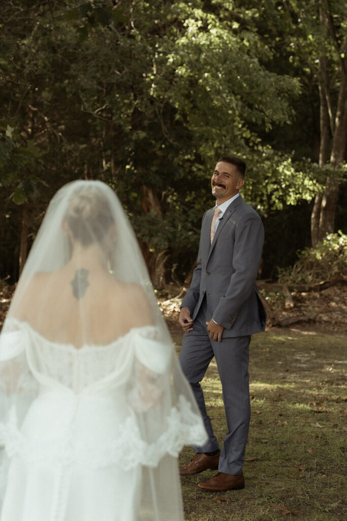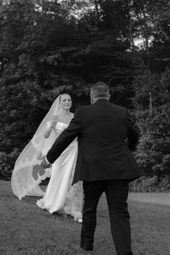They saw each other for the first time among the trees on the estate. I loved the field and all of the greenery—the sun was peeking through the trees, creating the most perfect lighting for their first look. They were both so smiley, and the entire moment felt incredibly sweet and natural.